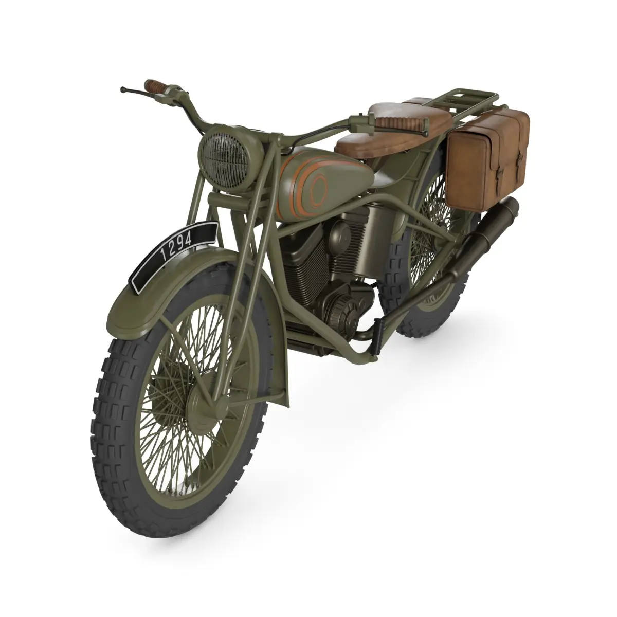 A rugged historical dual-sport motorcycle, featuring a sturdy steel frame in a deep olive green color, complemented by vintage leather saddlebags on each side. The worn leather seat shows signs of use, while the knobby tires show traces of mud from off-road adventures. The handlebars are slightly rusted, adding to the antique charm of this classic bike.