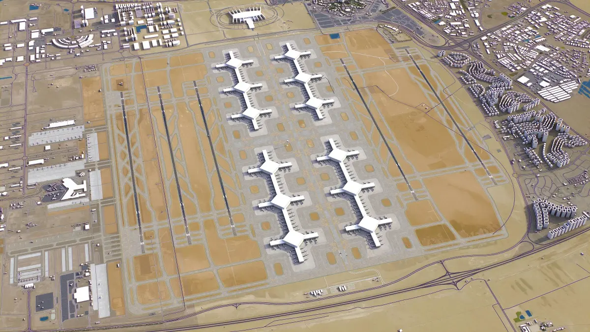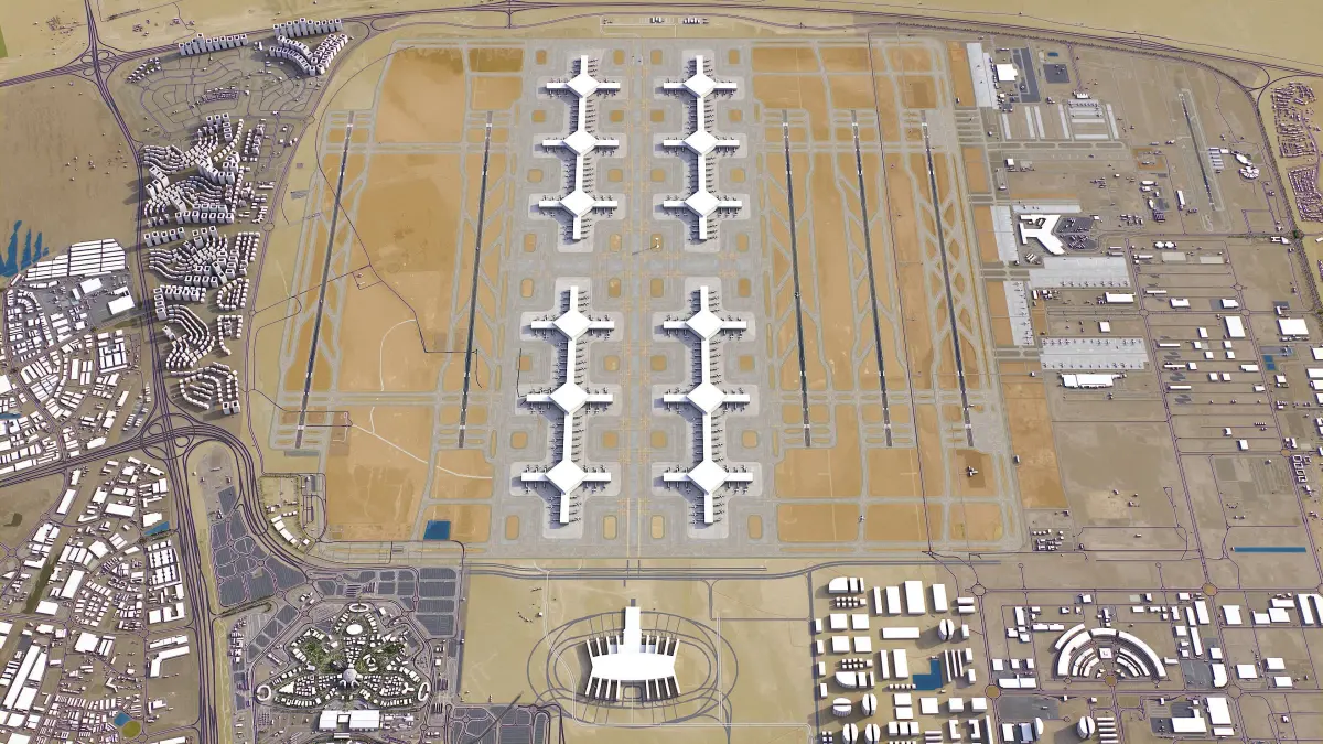 This is exact and accurate to scale 3D model of Dubai Al Maktoum International Airport - DWC and its surrounding area based on GIS data (May 2022)