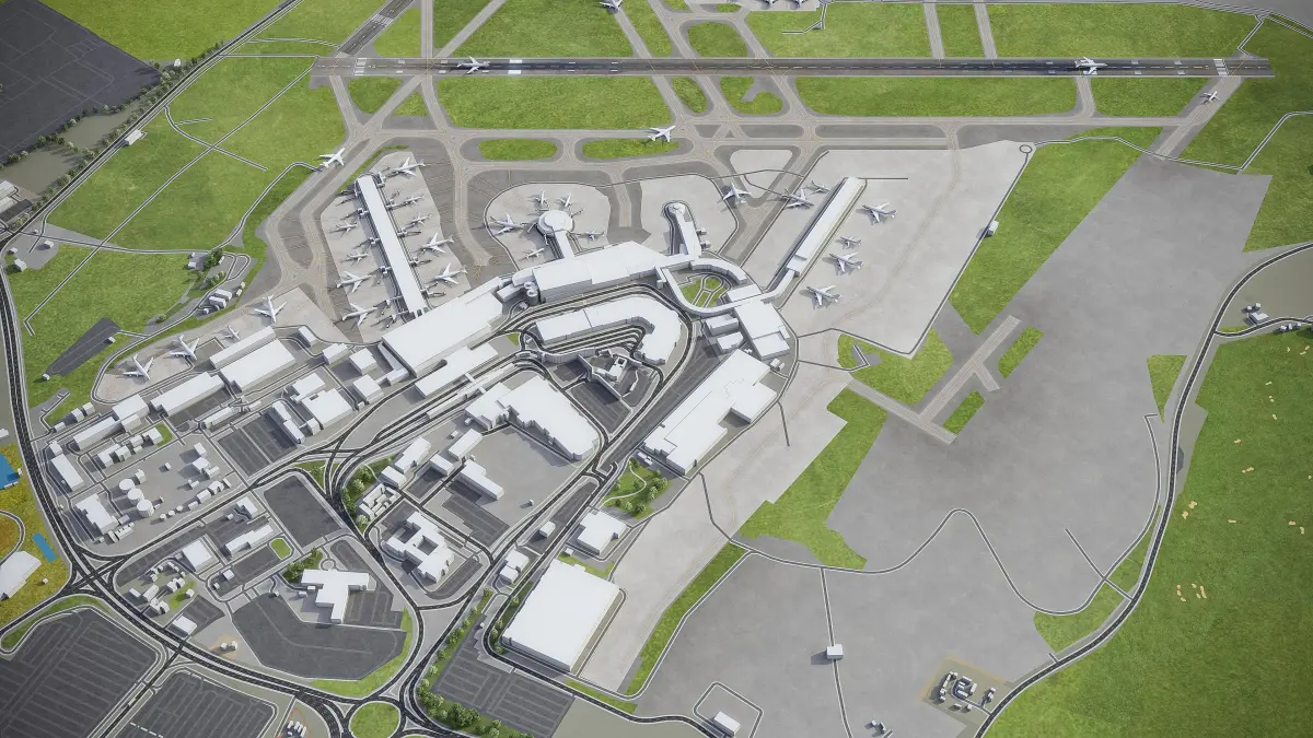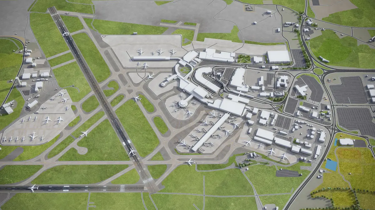 This is exact and accurate to-scale 3D model of Dublin Airport (DUB) and its surrounding area based on GIS data (February 2021)