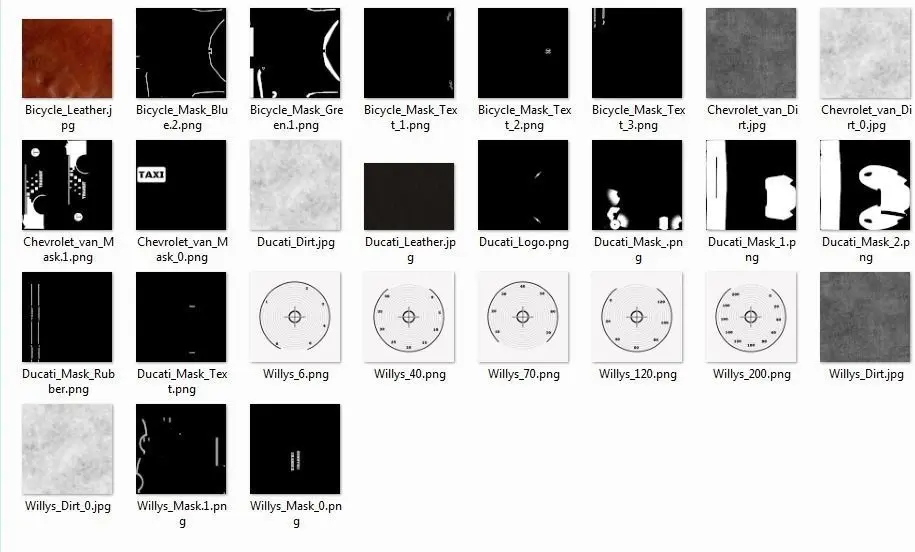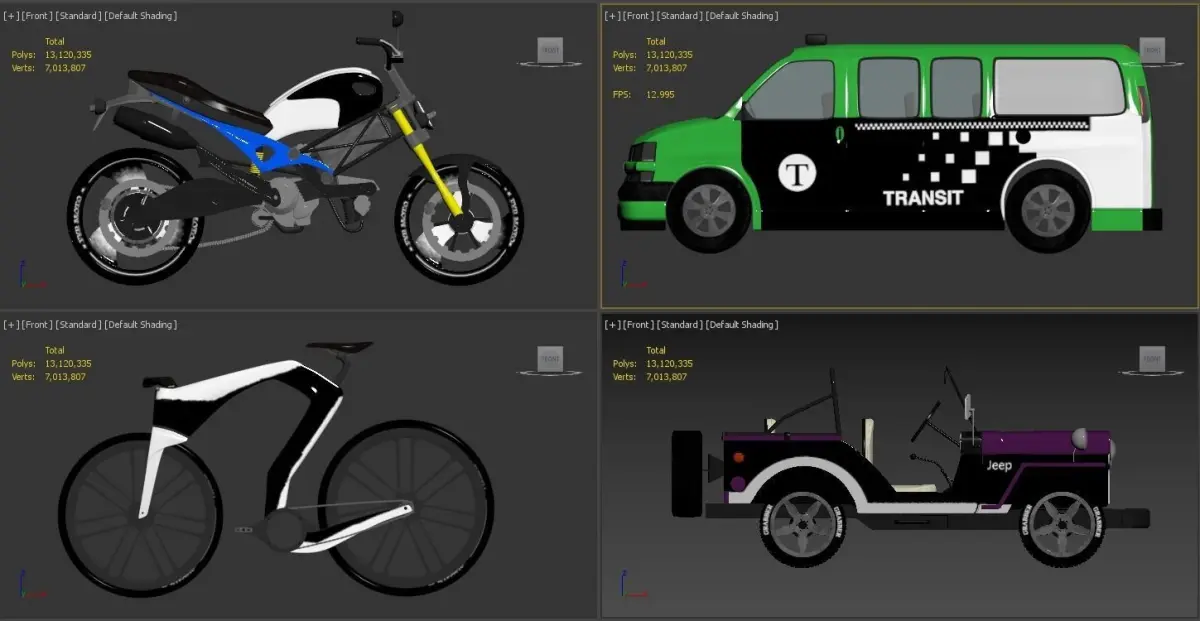 Realistic 3d model Ducati_Bicycle_Willys_Chevrolet. Does not include lighting and camera. All objects, textures and materials. Polygons: 13.120.335- Vertexs: 7.013.807. Max 2016 - corona 3 - obj- fbx - (Substance painter - Unfold ) have been used.Everything is completely modeled by myself.