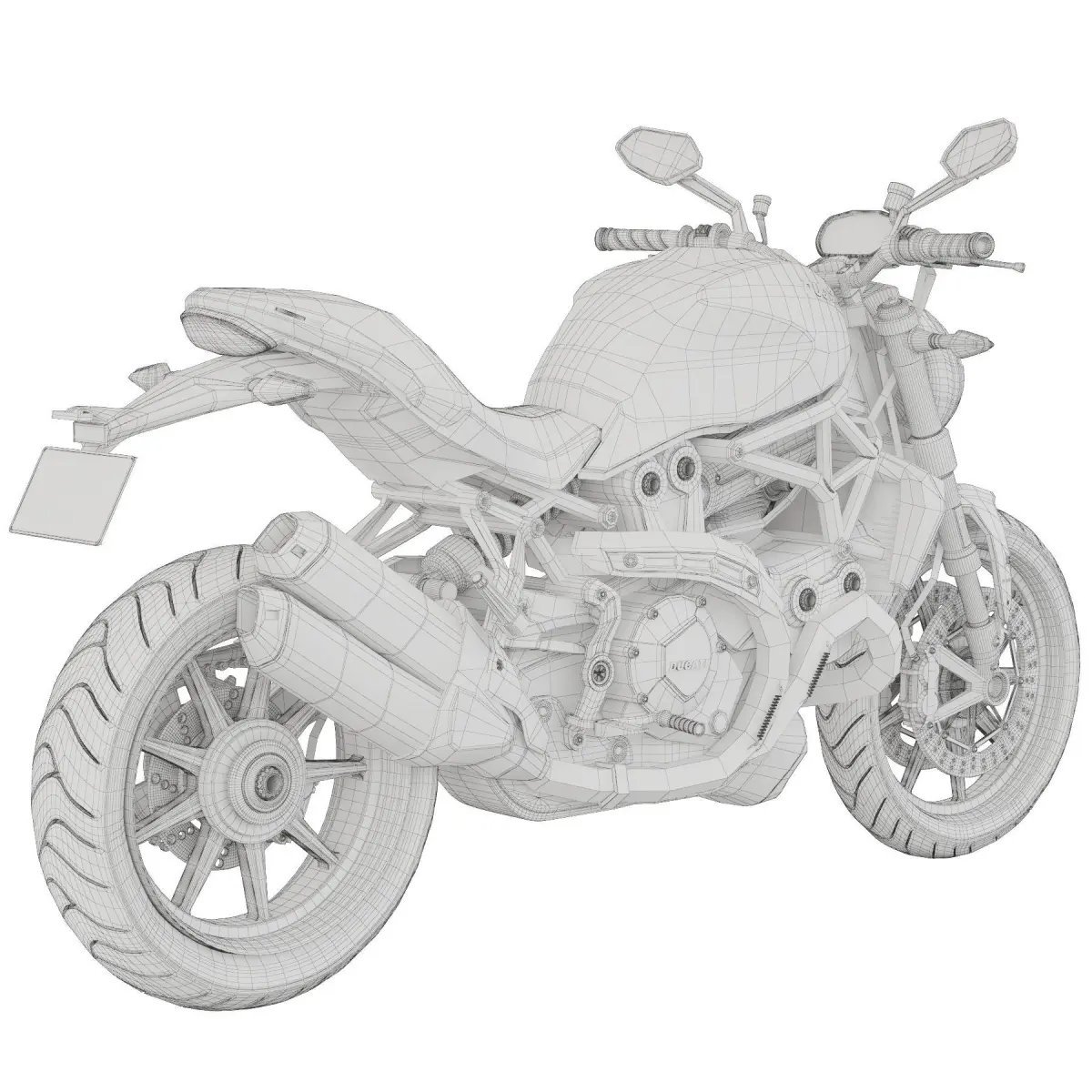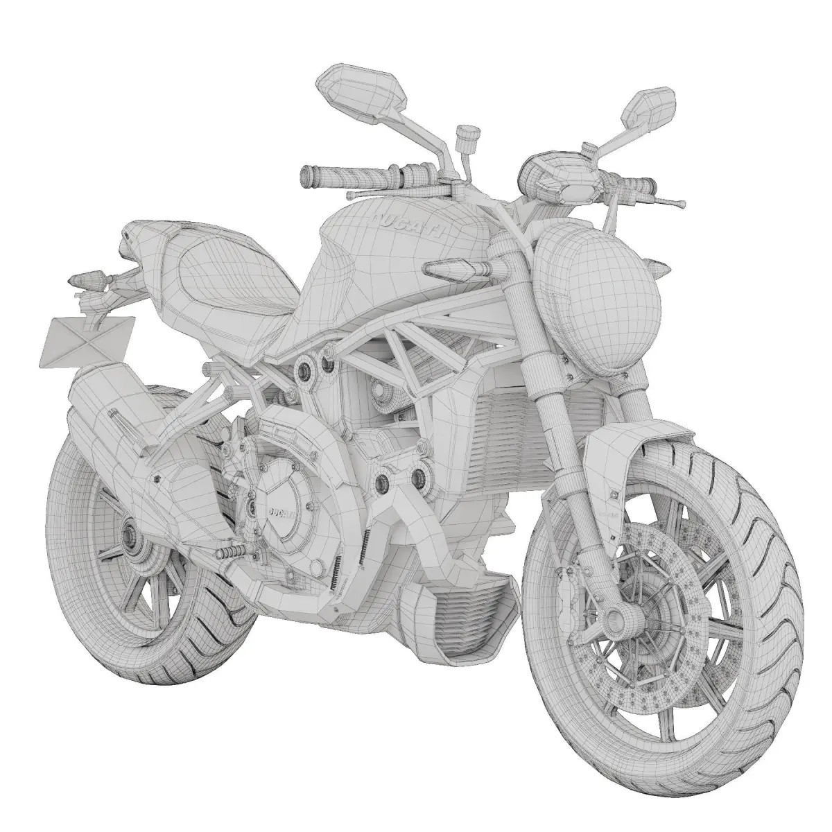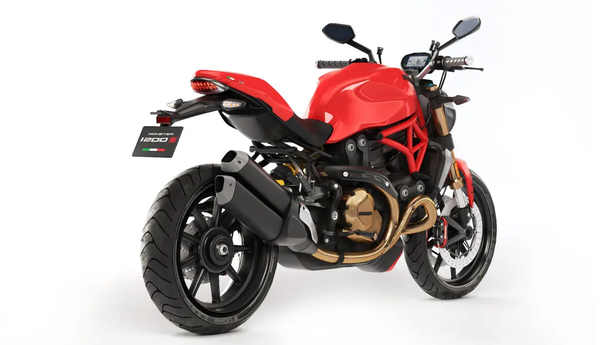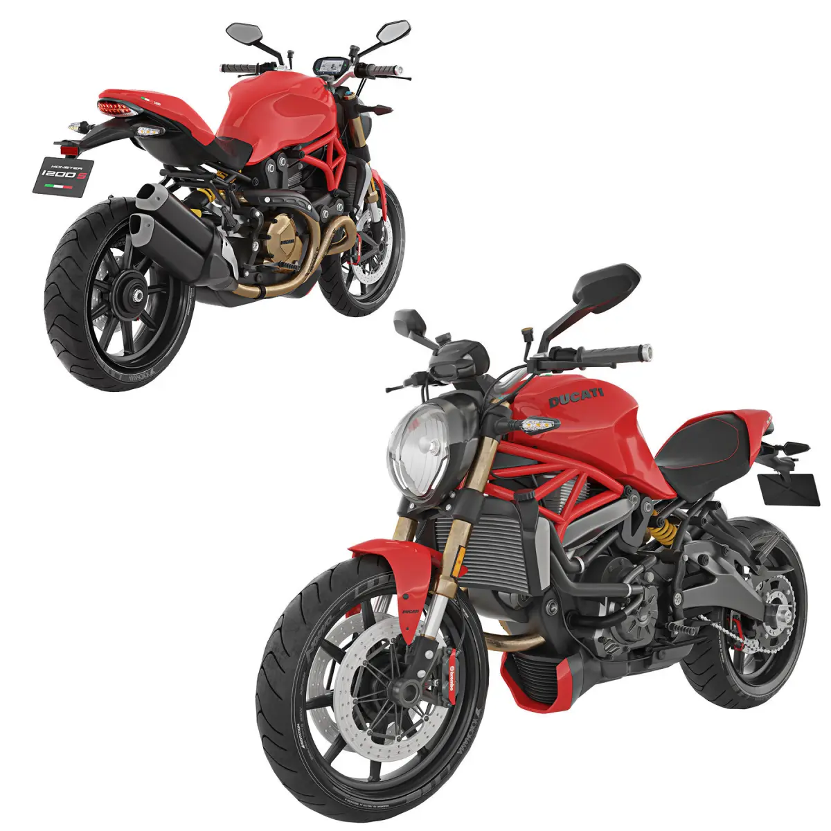 Detailed model of a modern Ducati sports bike, model - Monster 1200S. The details of the chassis, suspension, leather seats, controls, lighting and attachments have been worked out. The model can be used for close-up shots.
