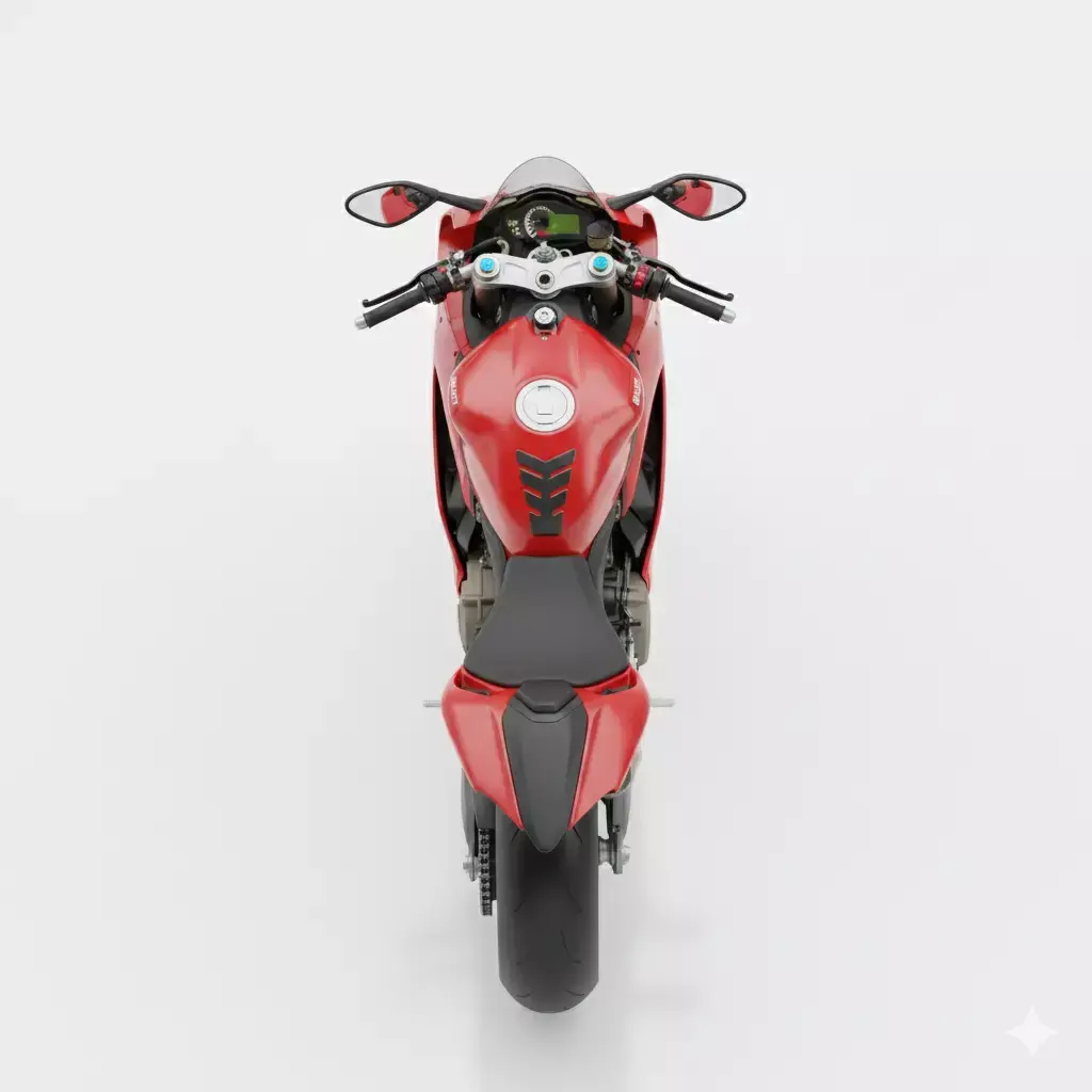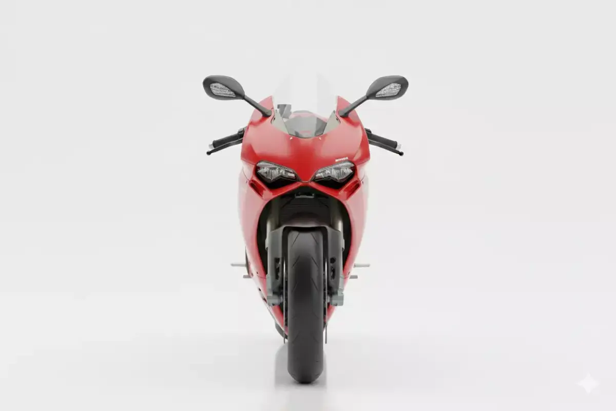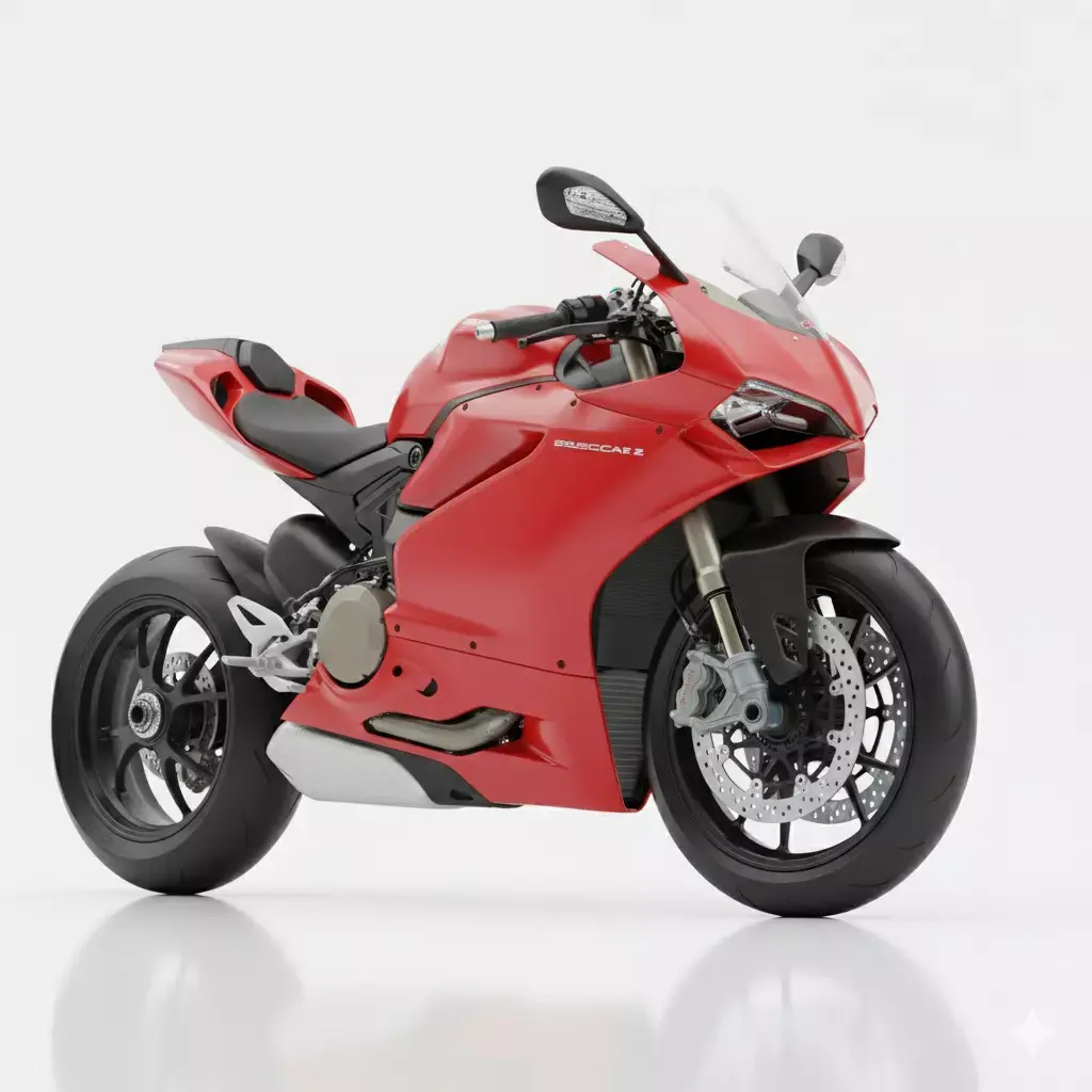This is a high-fidelity 3D model of a Ducati Panigale V4, a masterpiece of Italian motorcycle design and engineering. Rendered in the iconic Ducati Red, the model meticulously captures the aggressive, aerodynamic silhouette of the superbike, from its sharp front fairing and recessed LED headlights to the sleek, minimalist tail section. High-detail mechanical components are prominently featured, including the exposed engine casing, precise rear-set footpegs, and a sophisticated single-sided swingarm. The model also showcases performance-focused hardware such as Brembo brake calipers, large cross-drilled rotors, and high-traction Pirelli tires on lightweight black alloy wheels. This asset is ideal for high-end automotive visualizations, racing simulations, and professional marketing renders where mechanical accuracy and aesthetic premiumness are required.
