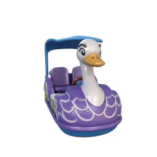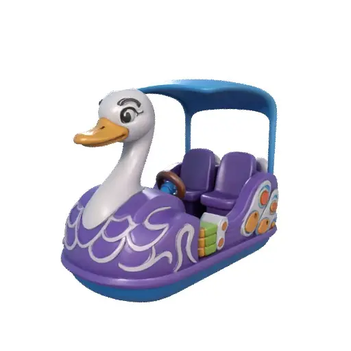 Design Features:Adorable Duck Shape: A cheerful white duck head with a bright yellow beak adds strong visual appeal, ideal for lakeside or fantasy park settings.Dual Seating: Equipped with two purple ergonomic seats and a central steering wheel, ready for a fun and friendly pedaling experience.Protective Canopy: The curved blue roof offers a cozy, shaded atmosphere—visually enhancing the comfort factor.Artistic Details: Decorated with colorful peacock-style tail patterns and elegant white wave motifs over a vibrant purple body for a magical and unique appearance.