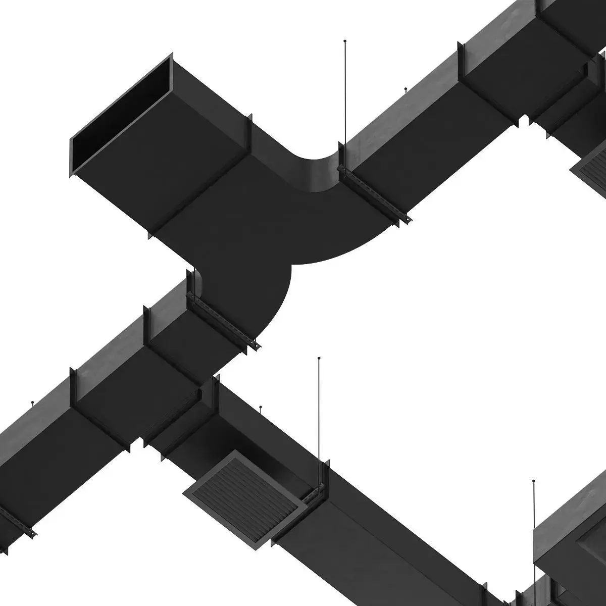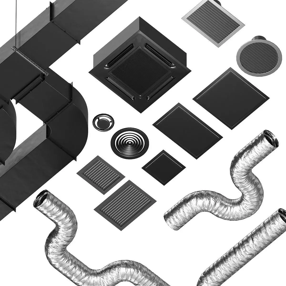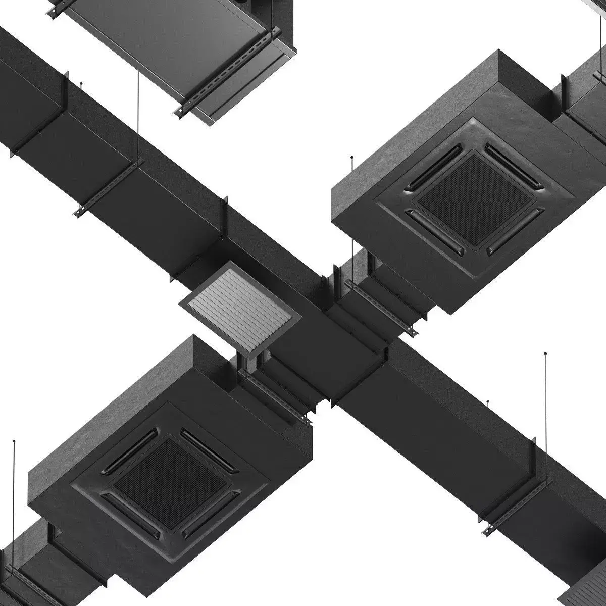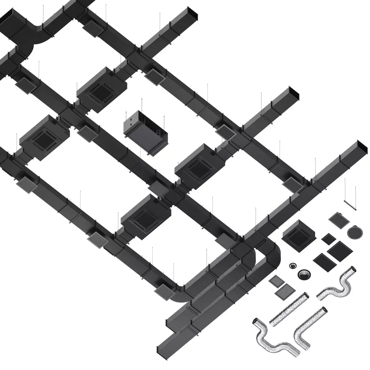 The ventilation equipment consists of: rectangular air duct pipe with fastening, perforated pipe hanger, flexible air duct corrugation, cassette air conditioner, rectangular ventilation grille, round ventilation grille, communications hatch
