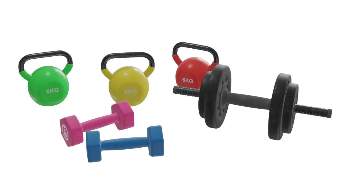 A high-quality collection featuring a variety of dumbbells and weights, including two small light weights, a larger dumbbell, and a set of kettlebells. Perfect for fitness-related scenes, gym environments, or home interior design.