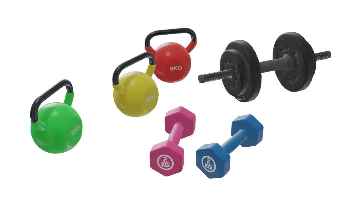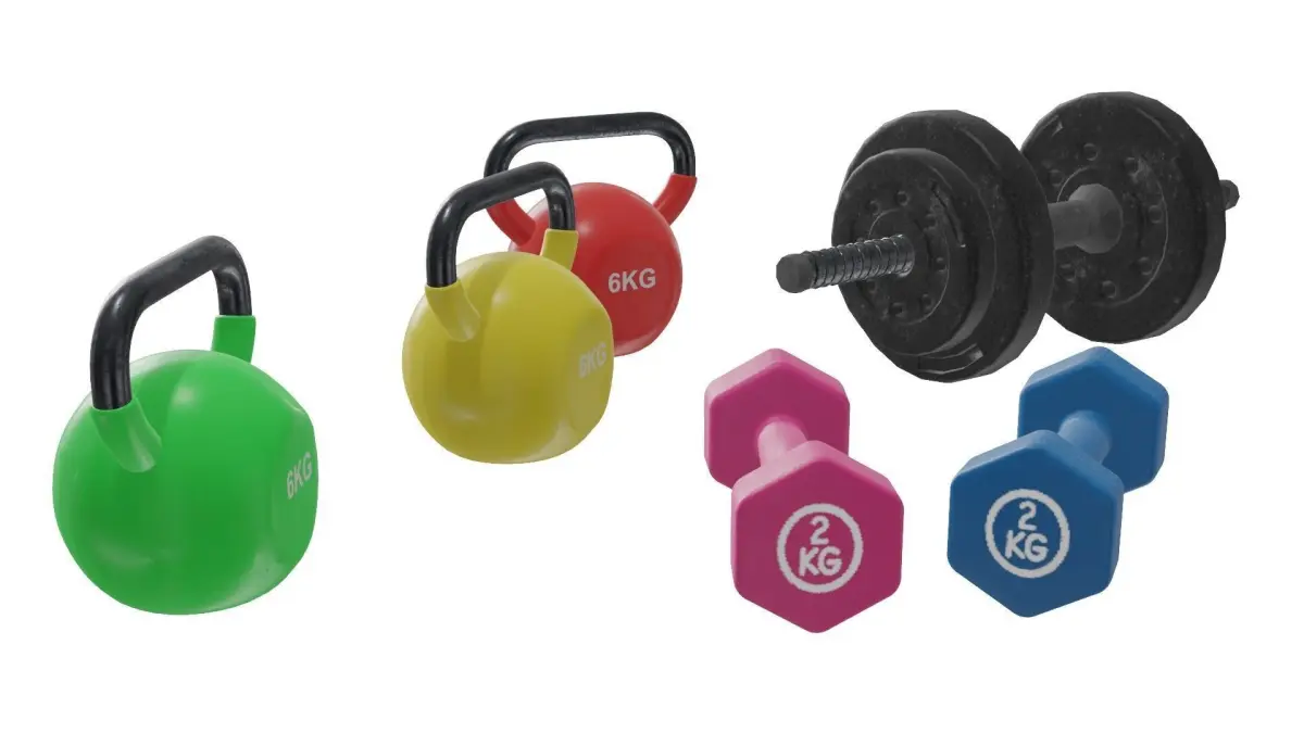 Keywords: Dumbbell 3D model, kettlebell 3D model, fitness 3D assets, gym equipment model, PBR textures, 3D workout props, home gym model, Blender dumbbell, 3D fitness model, realistic gym props, game environment, interior design, workout scene, 3D rendering, gym visualizations, 3D printing, game asset, PBR textures for gym.