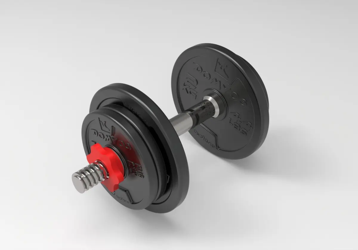 Fixed-weight dumbbells are weights created in a dumbbell shape. Inexpensive varieties consist of cast iron, sometimes coated with rubber or neoprene for comfort, and even cheaper versions consist of a rigid plastic shell that is filled with concrete.Adjustable dumbbells consist of a metal bar whose centre portion is often engraved with a crosshatch pattern (knurling) to improve grip. Weight plates are slid onto the outer portions of the dumbbell and secured with clips or collars. Shown to the right is a spinlock dumbbell, whose ends are threaded to accept large nuts as collars. Alternatively, a dumbbell may have smooth ends with plates being secured by a sprung collar.Plate-loaded (adjustable) dumbbells (a.k.a. loadable dumbbells)Spin-lockSpring collar clipsCompression ring collarIronmaster quick-lockSelectorized (adjustable) dumbbells are adjustable dumbbells whose number of plates (i.e. weight) can be easily changed when resting in the dumbbell stand. This is achieved by adjusting the number of plates that follow the handle when lifted, e.g. by turning a dial or moving a selector pin — rather than manually adding or removing plates. This makes it very easy to change the weight of the dumbbell between exercises, and the stand typically doubles as storage for the additional weights not being used for a particular exercise. There are different types of mechanism:Block typeDial typeGlide typeTwist type2-in-1 dumbbell/barbell