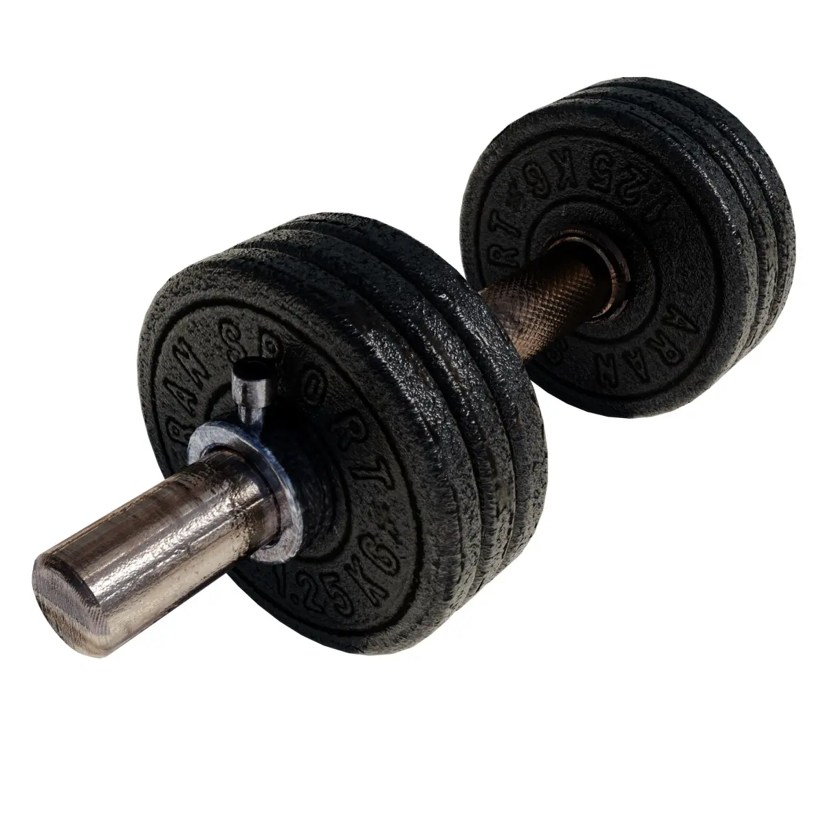 Classic dumbbell made of cast iron and steel. Contains color, specular and normal map from real drumbbell. All objects are mapped on single UV map. Textures can be seen in attached images.Weights, clamps and rod are separate objects so weights can be adjusted easily.