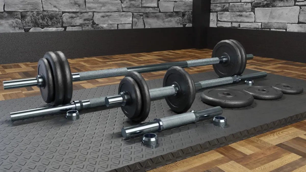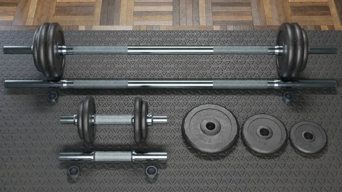 Featured dumbbells assortment.3 weights (1,25 kg, 2,5kg and 5 kg) and 4 bars with different accessories.