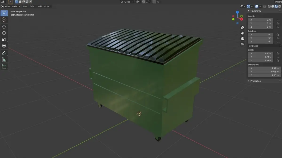 1.35m tall and 1.92m wide model of american style Dumbster. Made with Blender 2.92 and rendered in Eevee.