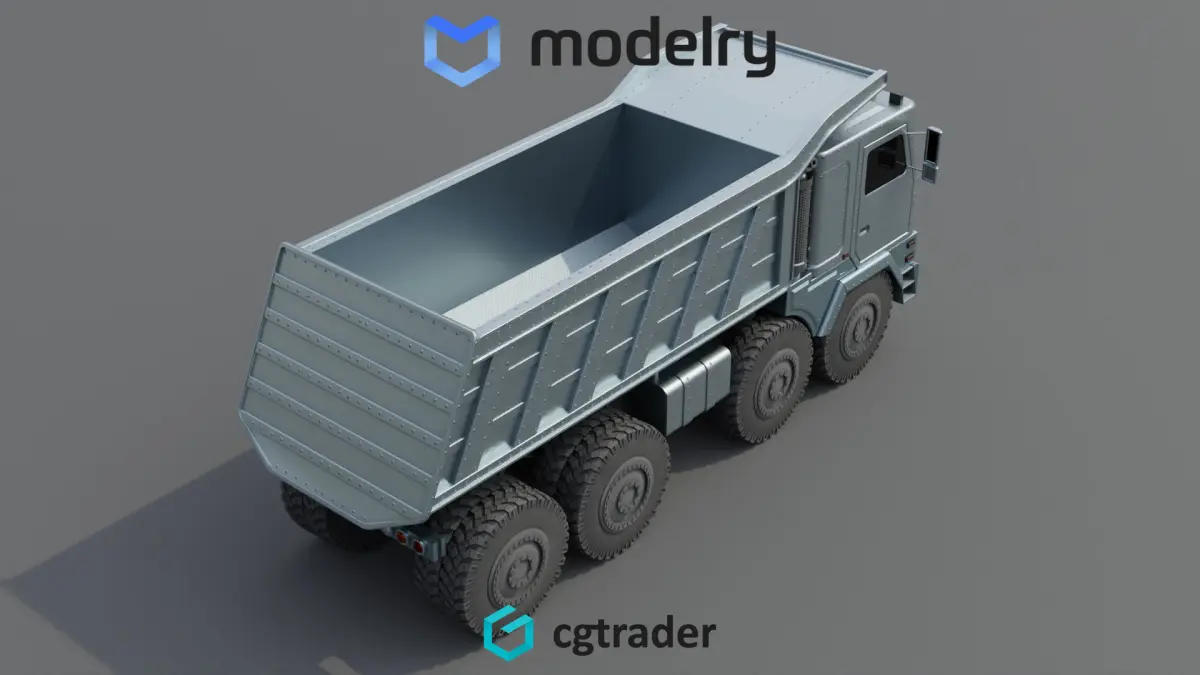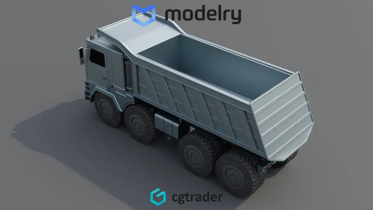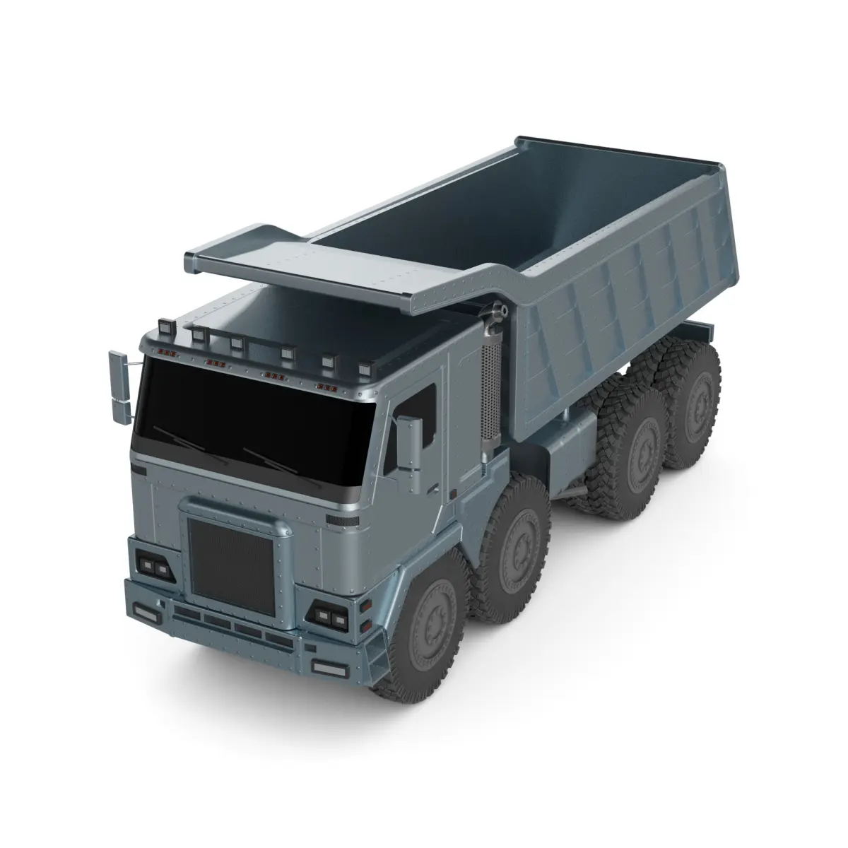 An industrial-grade dump truck built for heavy-duty construction work, boasting a sleek silver exterior finish, oversized wheels for off-road capabilities, and a powerful hydraulic system for efficient material dumping on the current timeline.
