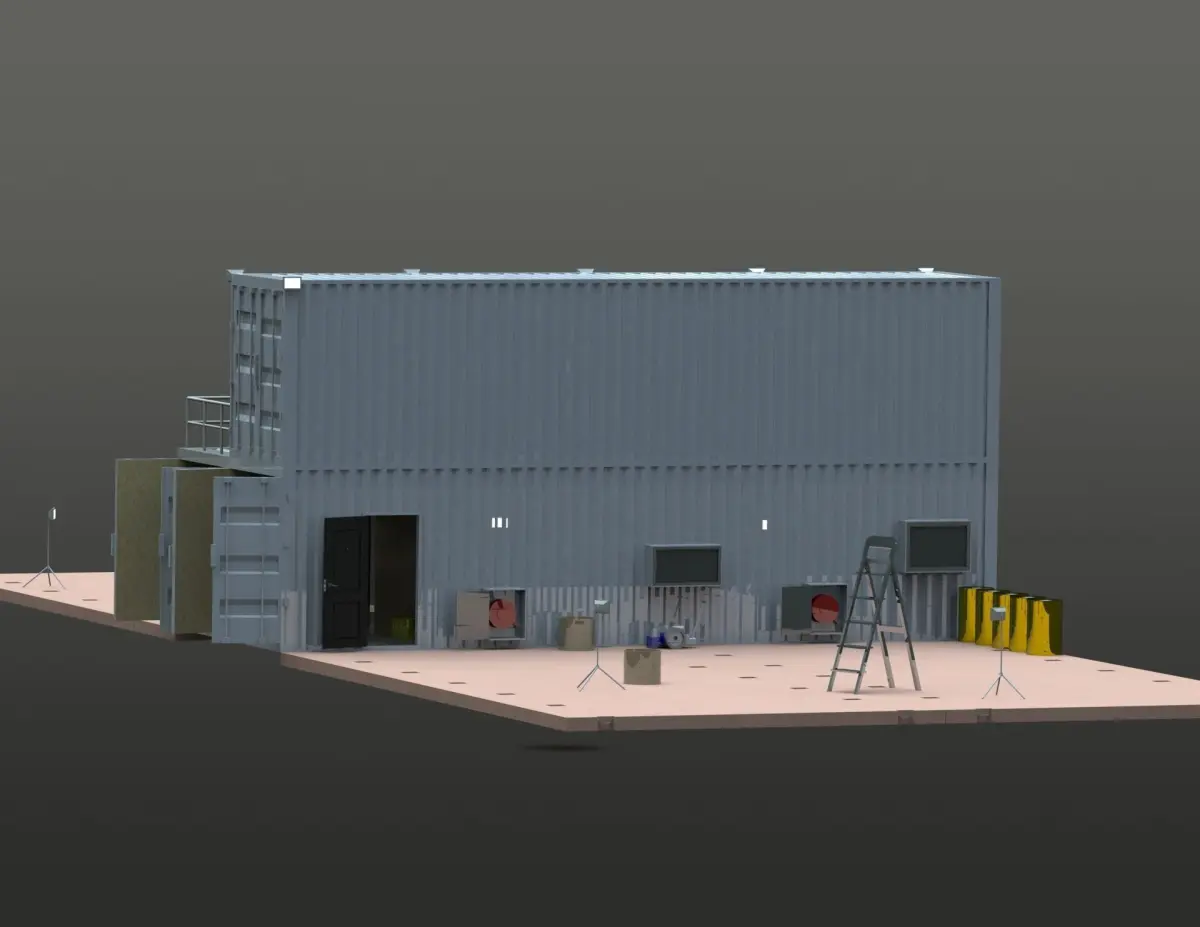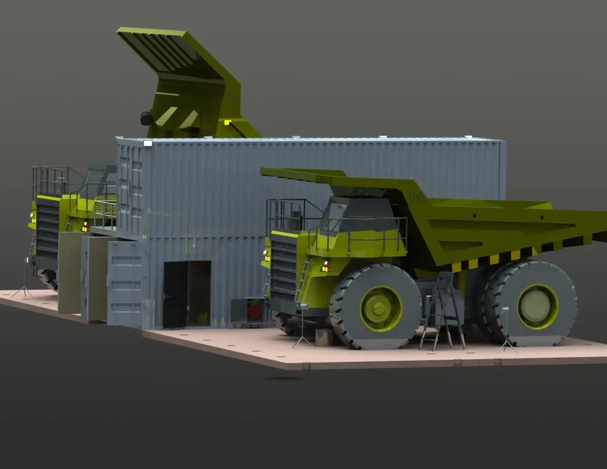 Service point for mining dump trucks. Made for sizes of two KomatsuHD785 dump trucks,for service in field . Two dump trucks can be serviced at point in same time (repair and maintenance). Assembly includes slabs, dump truck, three containers + equipment on site.Not Shown: Connection compressor to air Line, grease system to air Line.