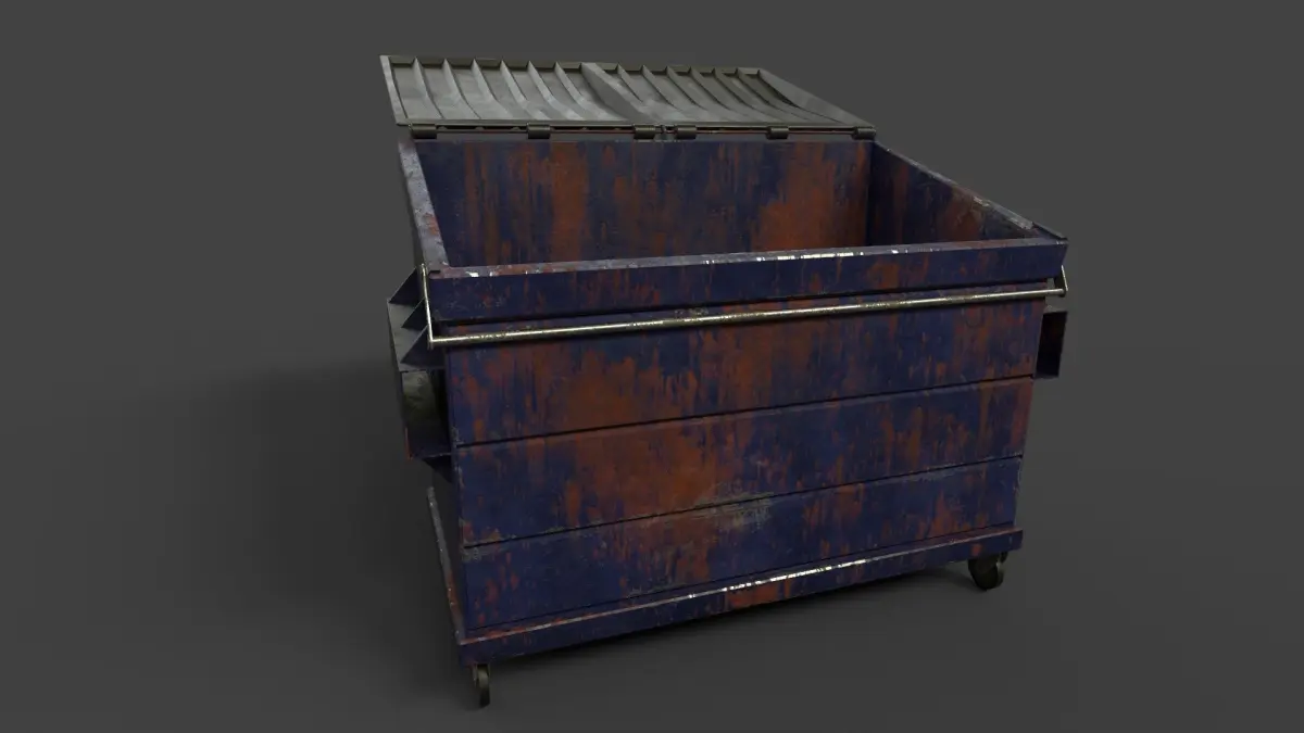 Dumpster, for video game use or any other 3D software. FIle includes FBX, OBJ, 3DS and Textures. The model is also set up for LODs and is PBR ready. The Textures include 3 different colours for the Dumpster (Red, Green and Blue) so you can choose which colour to use and also come with a clean version for each as well as a rusted version.