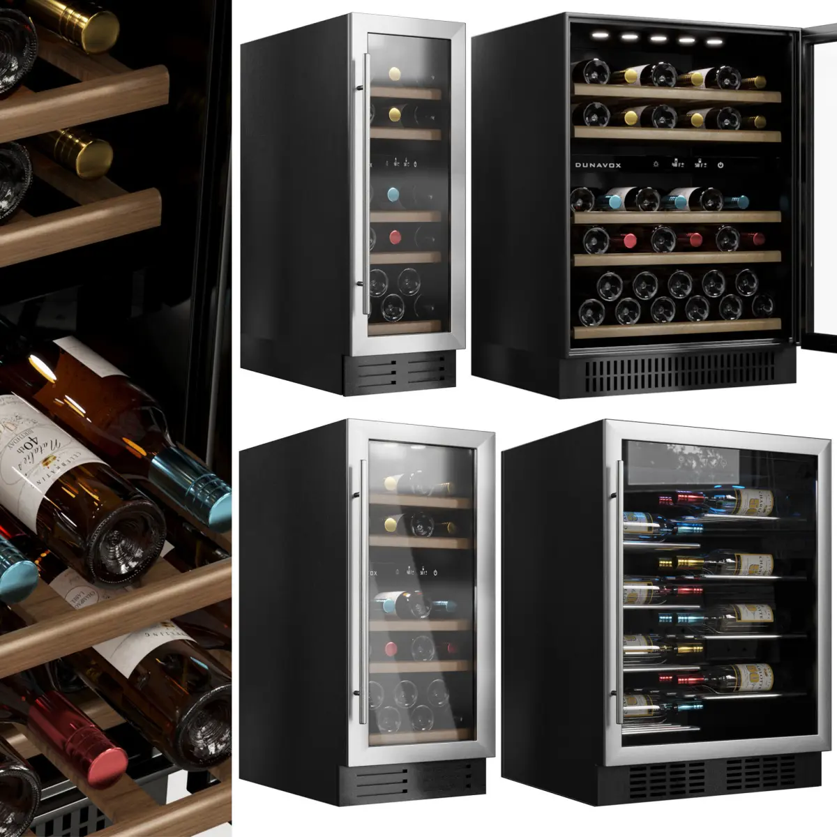 Polys: 474632Verts: 476625materials and objects in the scene are logically named and grouped.this file includes 4 wine coolers in 2 colors , black and silverevery cooler has 3 parts: door with pivot to open easily and you can change door material by 2 spheres in file (silver and black) , bottles are seperated to edit or delete easily and main parts of coolers .is is with details for closeup renders , you can open doors easily in file .