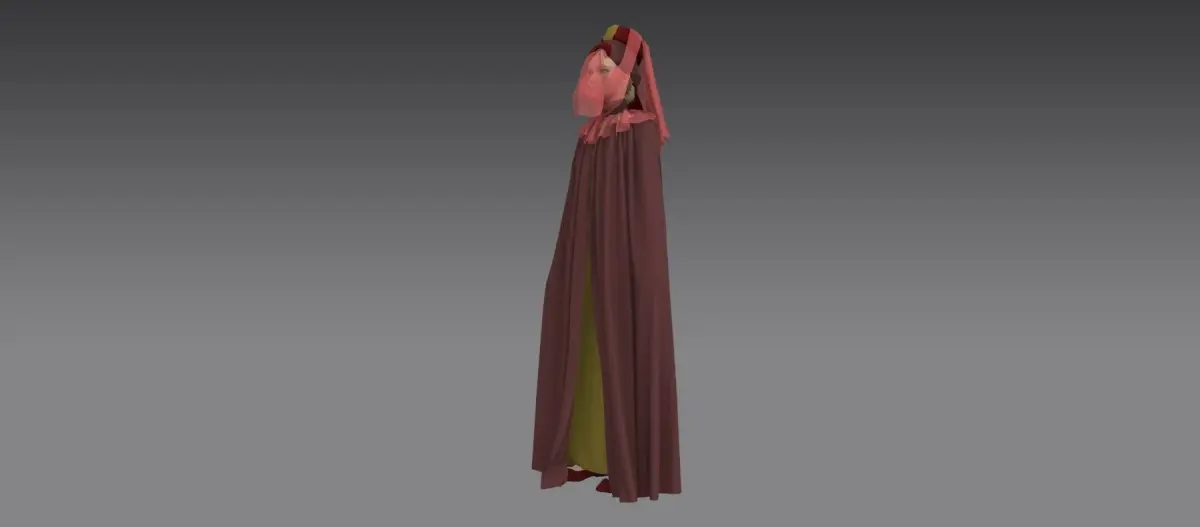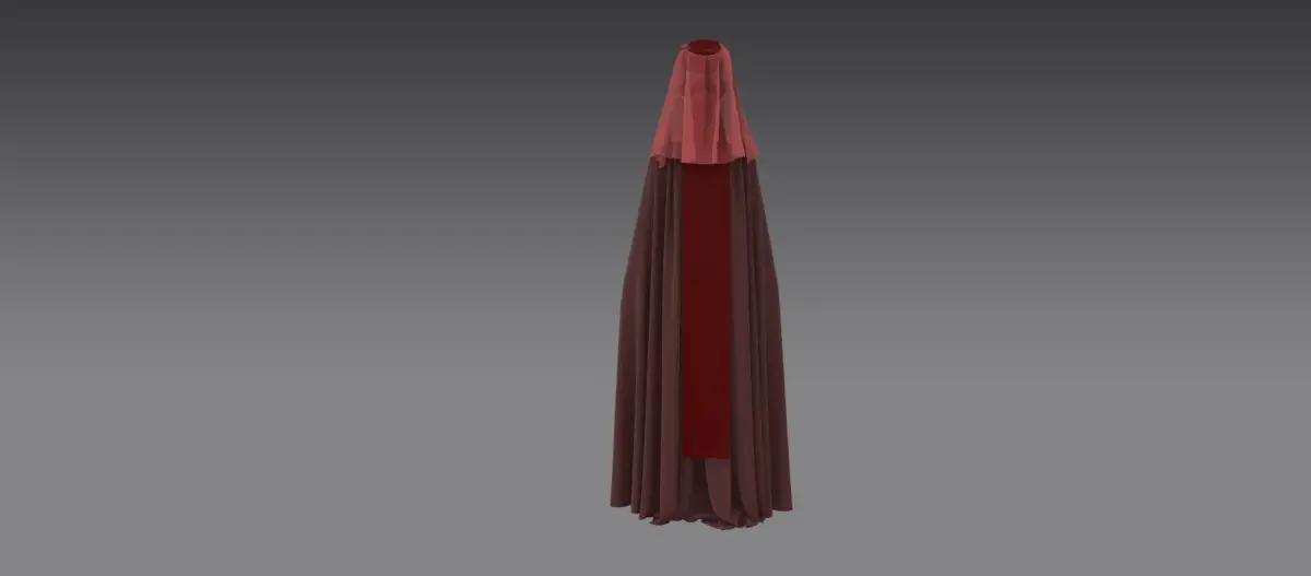 This 'Dune'-inspired outfit, created in Marvelous Designer, consists of a floor-length, deep maroon cloak that envelops the body in flowing, dramatic folds. Underneath, a long, olive-green gown provides a contrasting layer. The ensemble is completed with a high, structured collar that frames the face, adding a sense of regality. A sheer, red veil drapes over the head and shoulders, enhancing the mystique and solemnity of the look. The overall effect is one of elegance, authority, and otherworldly presence.