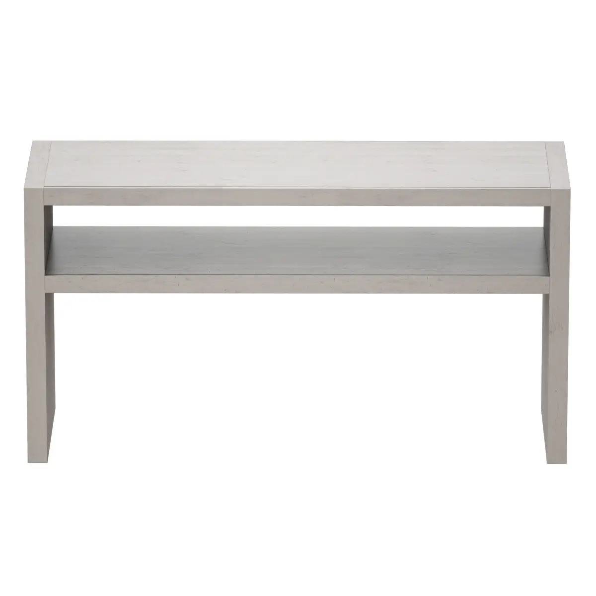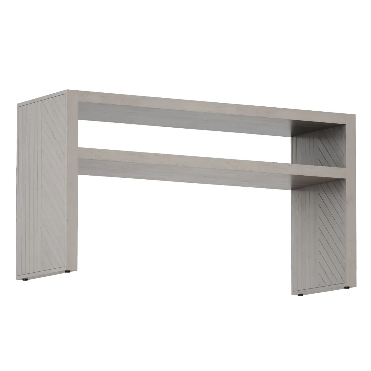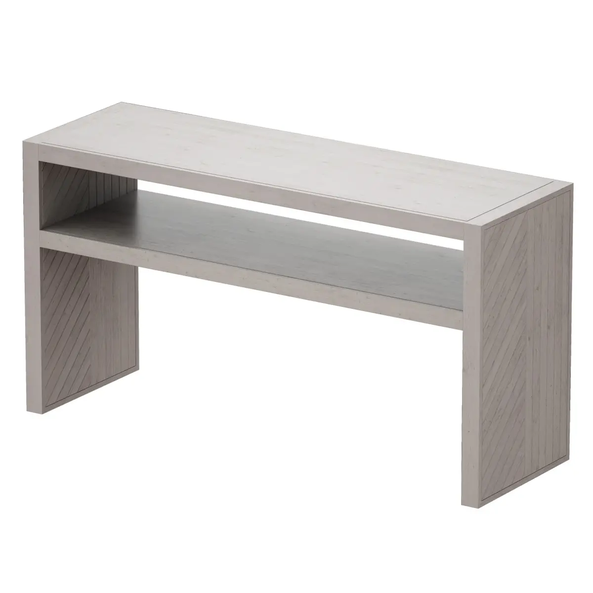 Seller Description:Employing the time-honored technique of parquetry, skilled woodworkers add artisan rusticity to our clean, contemporary Dunewood console table. Bringing geometric complexity to the waterfall legs, pieces of mango wood are carefully cut and inlaid by hand to create a modern mosaic of angled lines. A wash of white and a light distressing add a whisper of color and texture to enhance this striking table's sculptural presence. Designed by Blake Tovin of Tovin Design, the console table features an open shelf for display or storage.Overall Dimensions Width: 56 Depth: 18 Height: 30 "