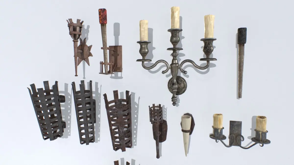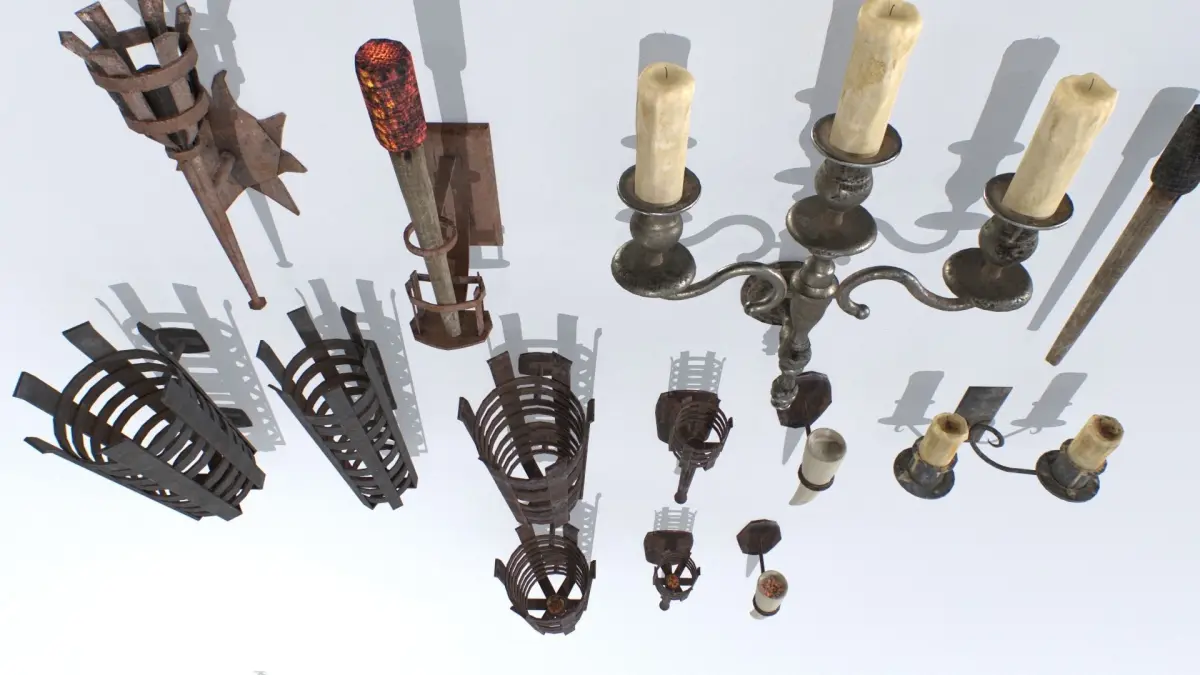 Collection of dungeon/castle/medieval light sources including: braziers, torches, candles, candlesticks, cauldrons, burned wood, chandeliers and candle walls. Some come with emissive textures and burning embers textures when particles are used. Supports 4.24+ versions.