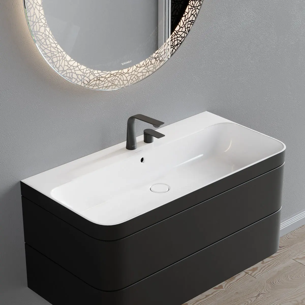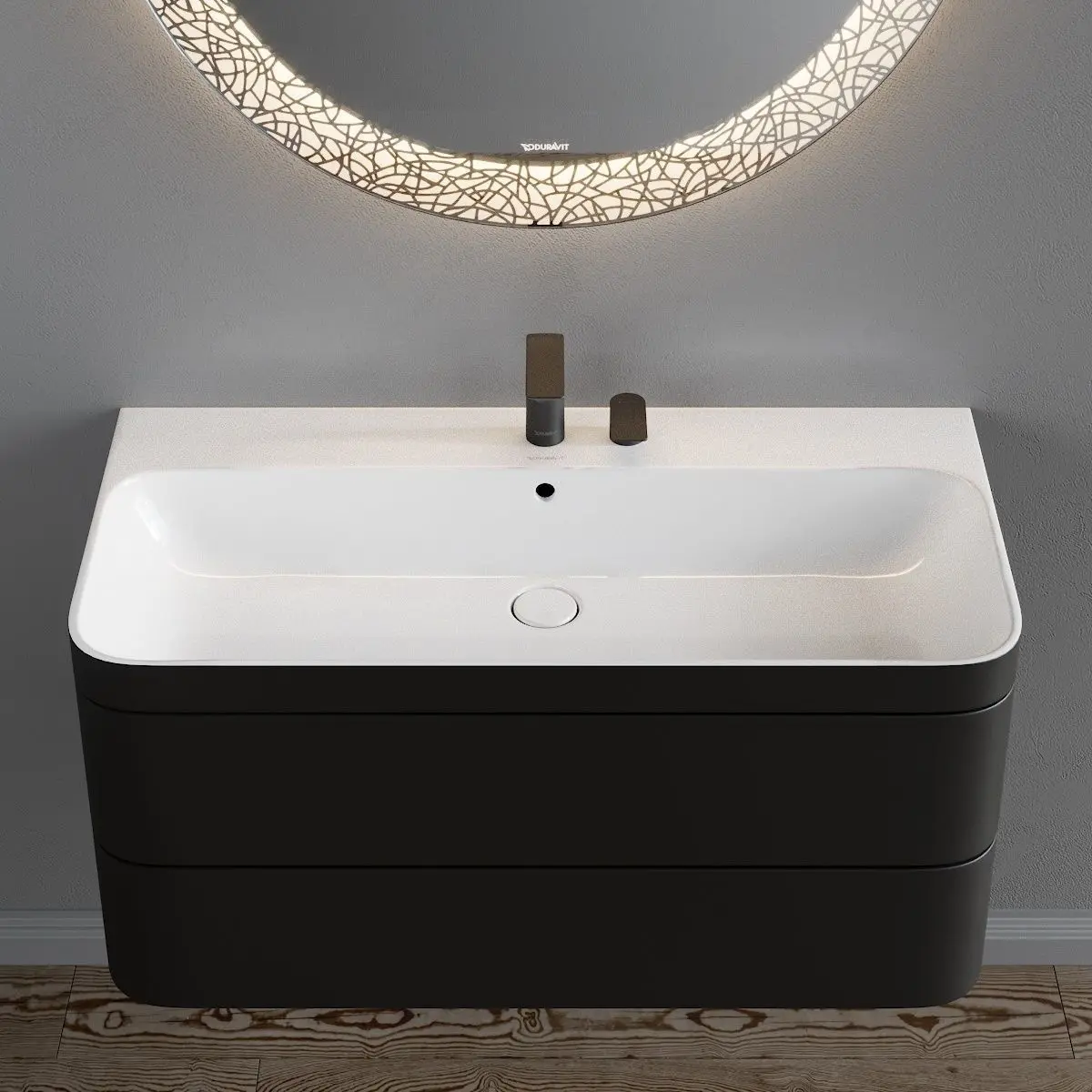 Vanity unit:Collection - Happy D.2 PlusType - Vanity unit / washbasinMaterials - Laminate, CeramicDesigners - Sieger DesignDesign Year - 2020Product code - HP4348 E/N/O/TDimensions: 975 x 850 x H 490 mm
