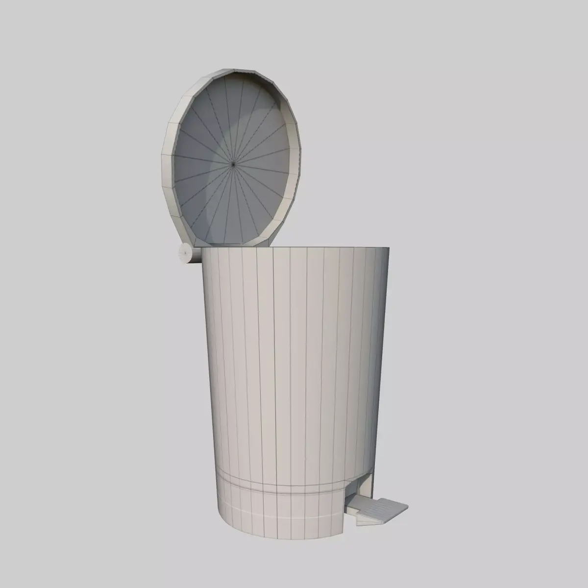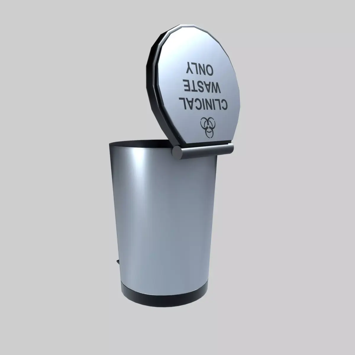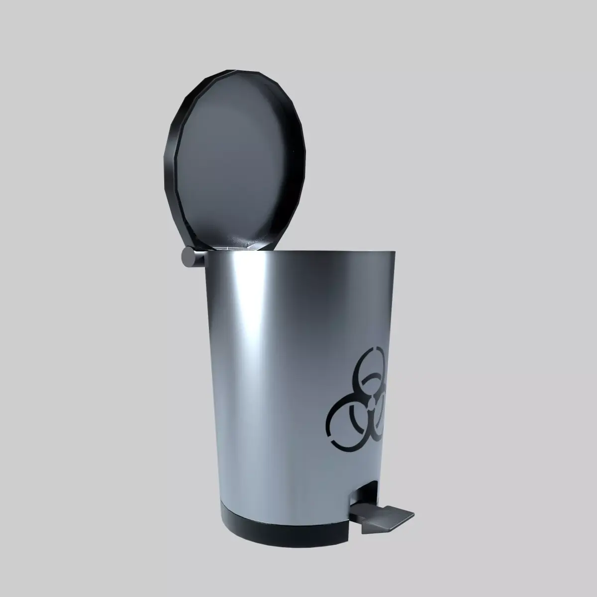 A high-quality 3D model of a dust bin designed for clinical and hospital waste disposal.The model features a foot-operated pedal, swing lid, and biohazard marking, making it ideal for medical or laboratory environments.