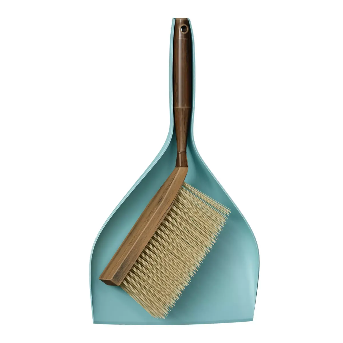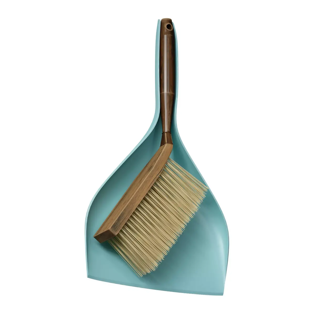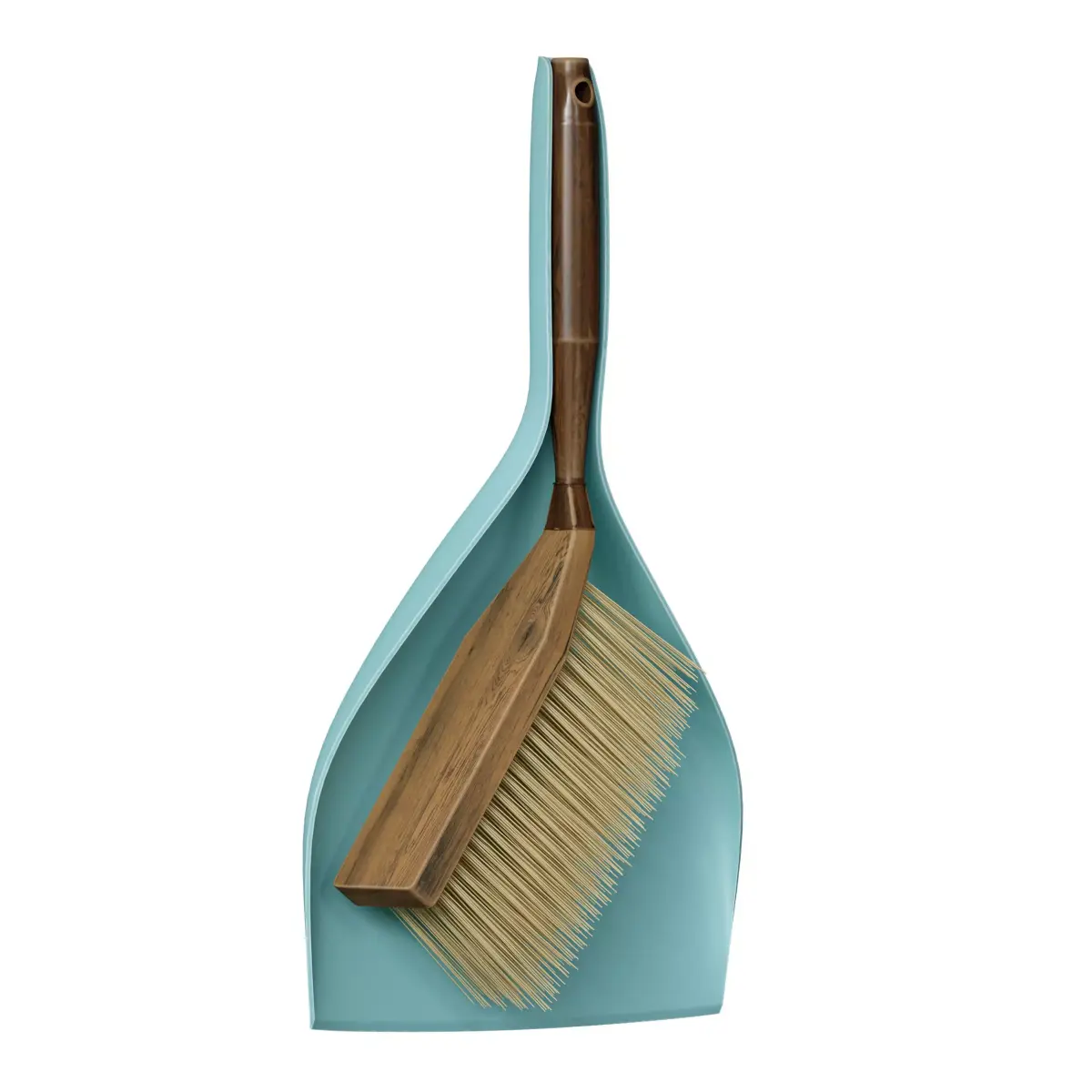 3D model of a plastic dustpan with a wooden brush. The dustpan is made of blue and turquoise plastic, the brush is light wood, and the bristles are light beige.
