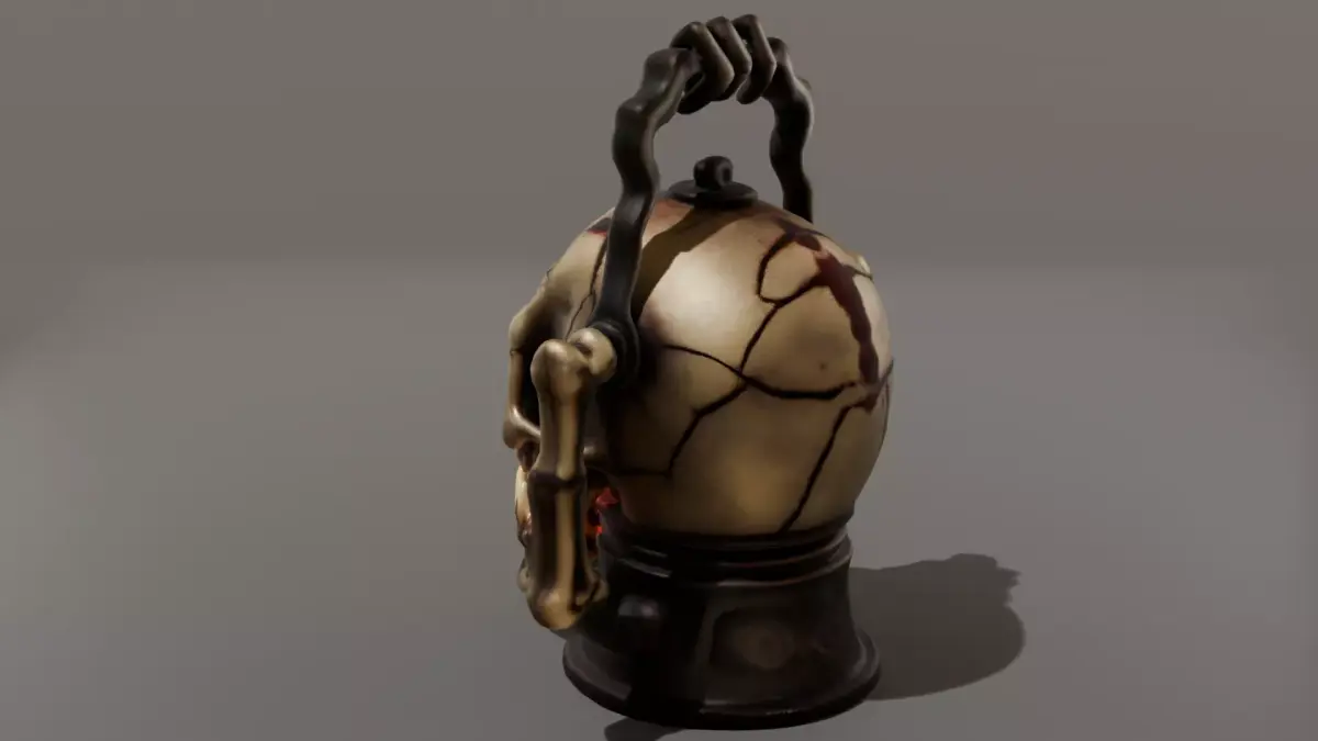 A dark fantasy hand lantern with a sinister, skeletal-inspired design, evoking the feeling of a wandering necromancer carrying an eerie light through forgotten places. Its haunting aesthetic makes it ideal for horror, dark fantasy, dungeon, or RPG environments.