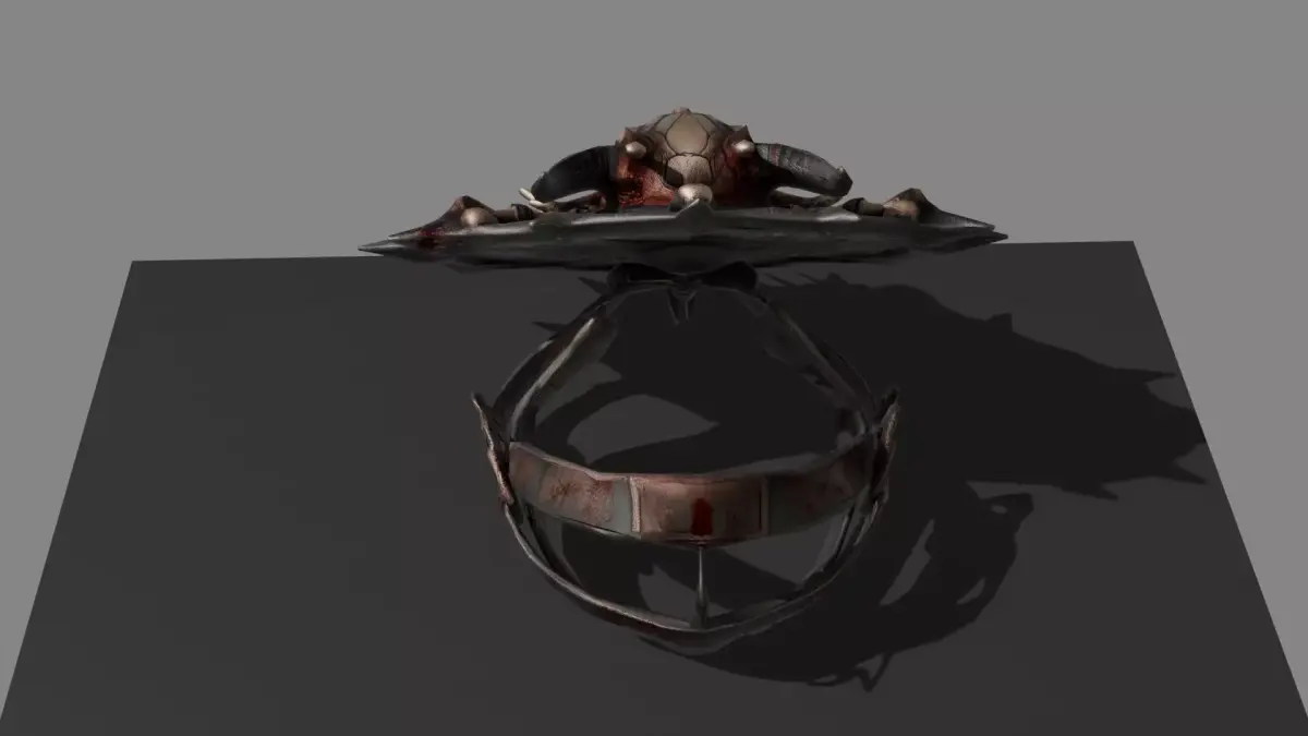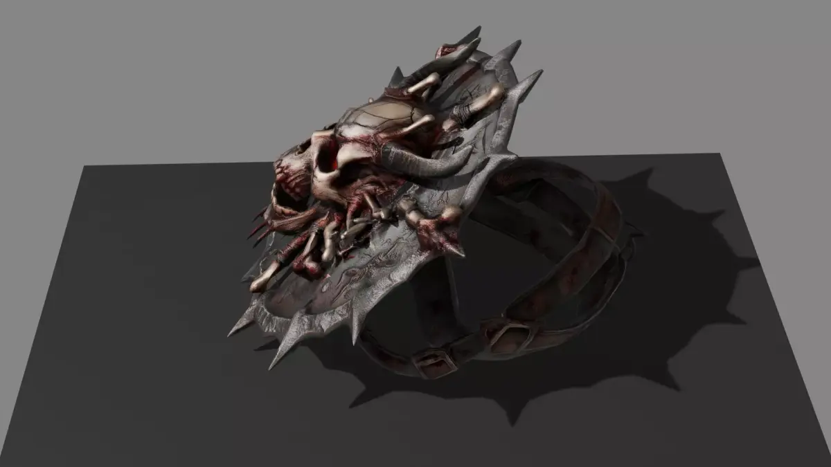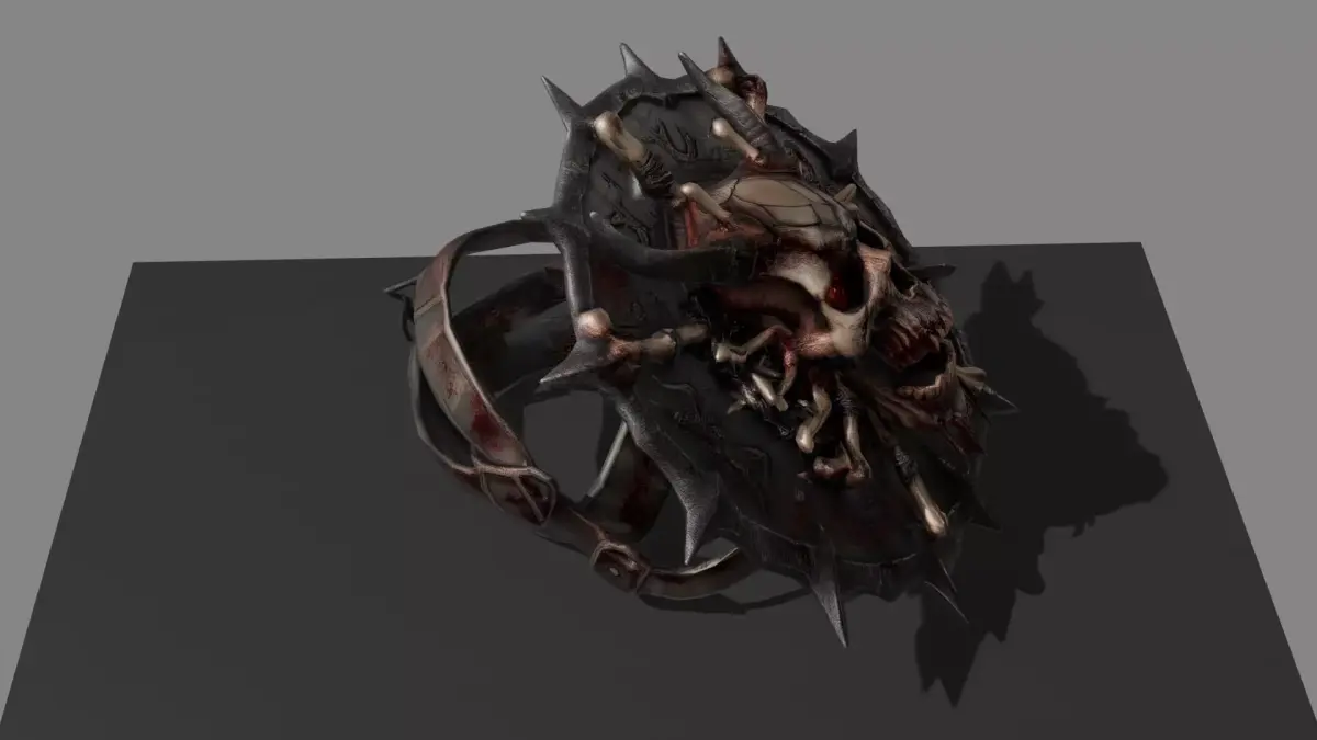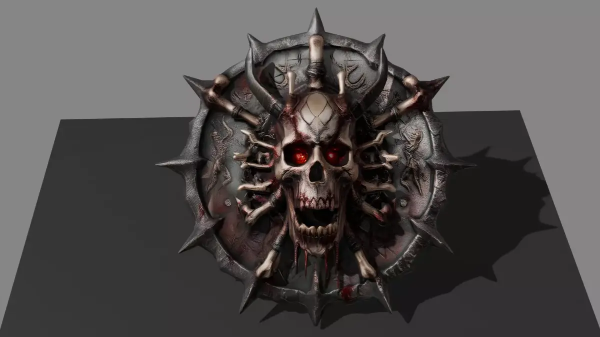 A disturbing skull shaped shield designed with a dark and unsettling aestheticThis model features strong silhouette definition and detailed sculpted forms making it ideal for dark fantasy horror or gothic themed game projects