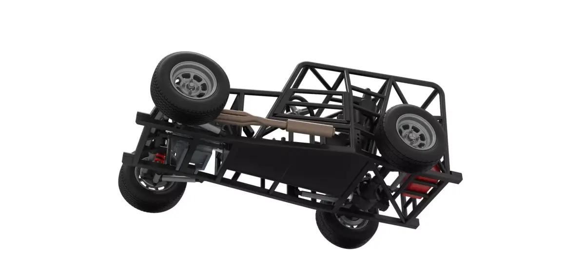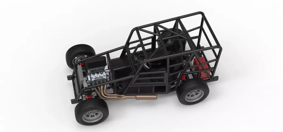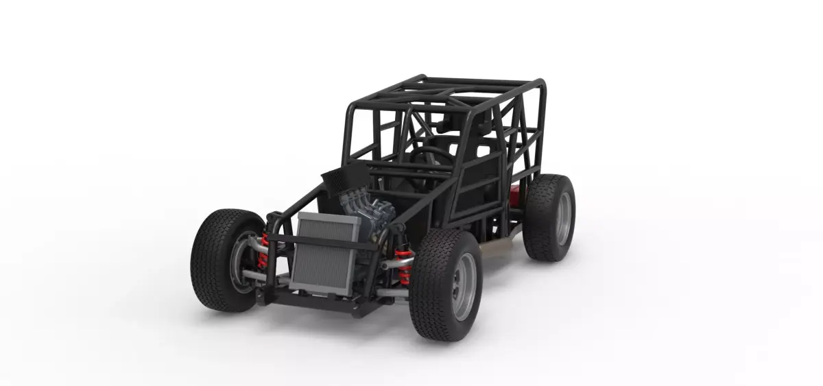 The model consists of parts: Air filter, Engine, Exhaust, Frame door, Frame, Front rims, Front tires, Radiator, Rear rims, Rear tires, Seat part 1,2, Shifter, Steering wheel, Tank.