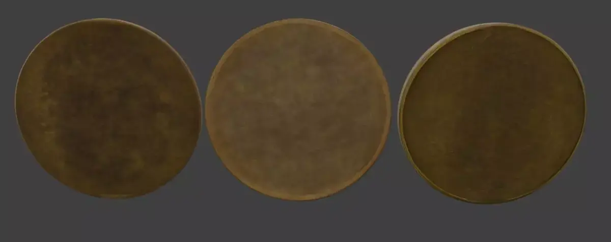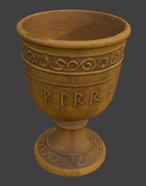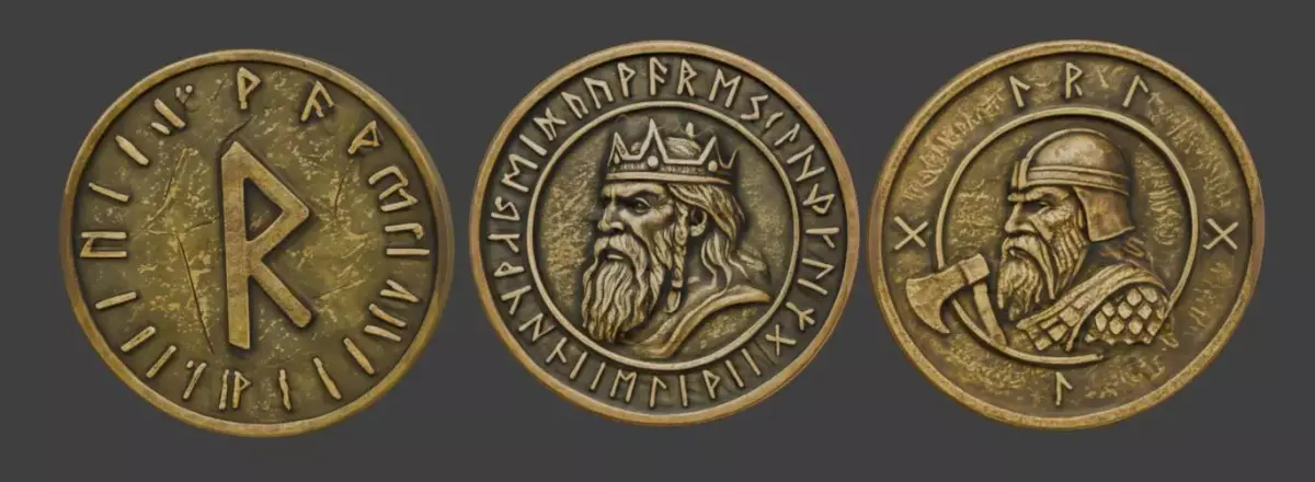 An assortment of old dwarven gold items, reminiscent of the raw craftsmanship of underground forges. The collection includes an ornate chalice with swirling runes carved along the stem and rim, standing tall like a guardian of forgotten feasts; three intricately detailed coins - one with a central rune of power, the second depicting a crowned king with a stern gaze, and the third depicting a fierce warrior wielding an axe, each surrounded by cryptic inscriptions; a simple but solid plate with an old patina, perfect for shared meals; a wide, shallow bowl decorated with delicate filigree patterns, and a jug with a handle whose body was carved with runes. These relics whisper tales of dwarven kings, battles and arcane knowledge, combining functionality with mystical symbolism in a timeless golden hue.