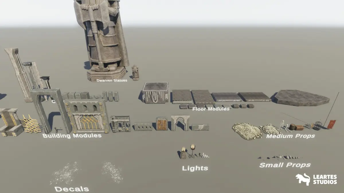 Dwarven Dungeon Environment with 102 Unique Meshes. Including all showcased assets, and high-quality assets. With a good level of detail and optimized for Game Ready Projects.Creative Direction by Leartes Team, Environment made by talented Artist “Ian Siraña Calpe”Includes Showcased Preassembled SceneIf you want to populate your game environments or any kind of Virtual Production levels here is the pack that you get and use to get high-quality visuals and well-optimized assets.