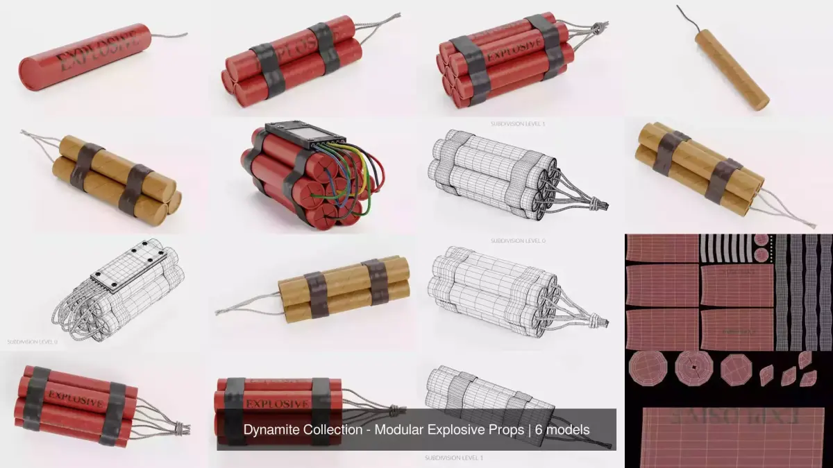 A versatile collection of six dynamite assets covering multiple common explosive configurations, from single sticks to bundled charges and timed setups. The set includes labeled and neutral variants, allowing use across realistic, stylized, or generic scenarios without any specific brand or context lock-in. Clean geometry and clear material definition ensure the props read well both as foreground elements and supporting scene details.