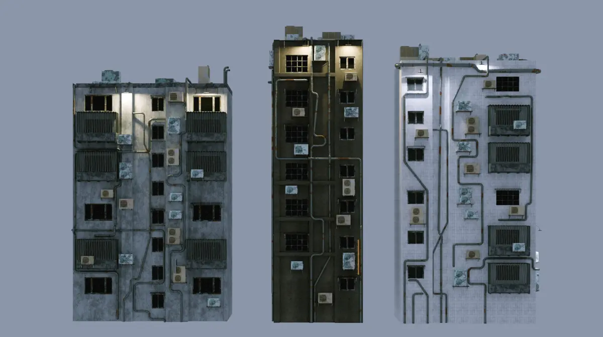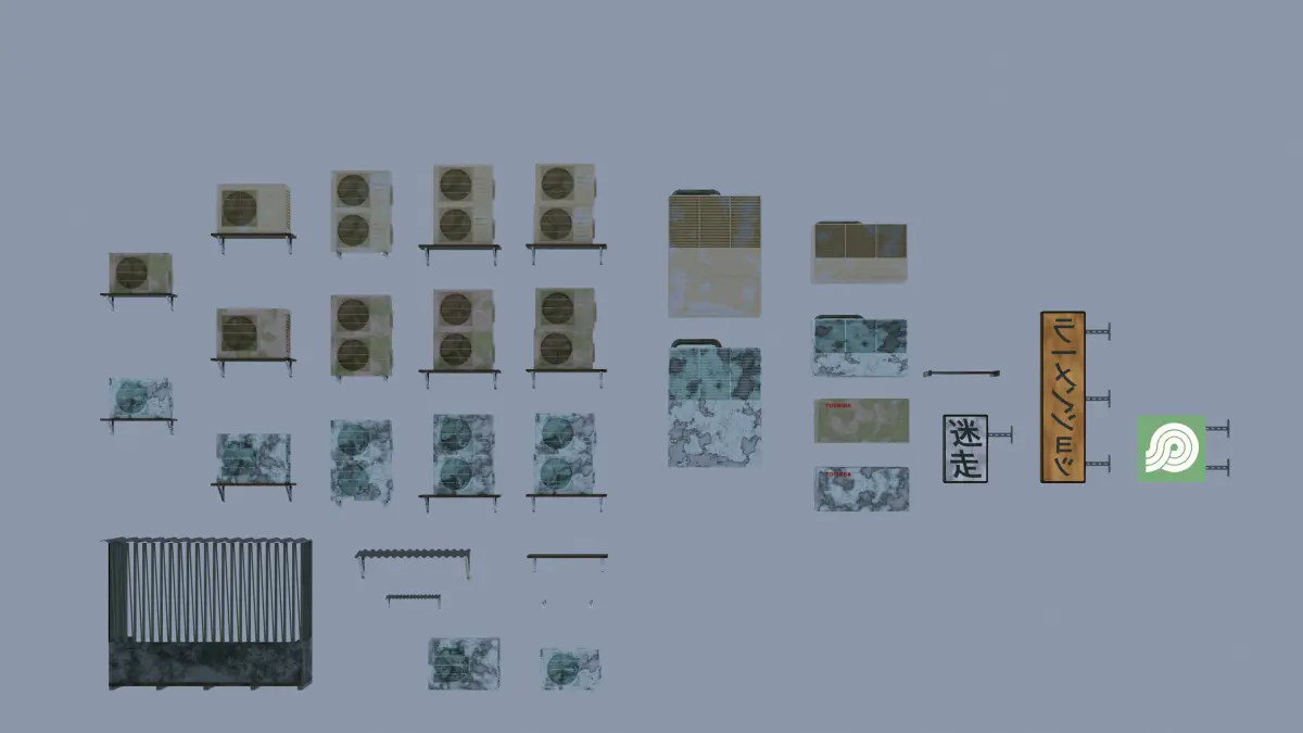 Every assets are available separately, allowing you to use this assets in your own scenes. This pack consist of : 3 unique buildings, with detailed facades and rooftops. There is 2 different ACs unit models with size variation, wall-attached clothes hanger, 3 unique neon signs, and HVAC units.