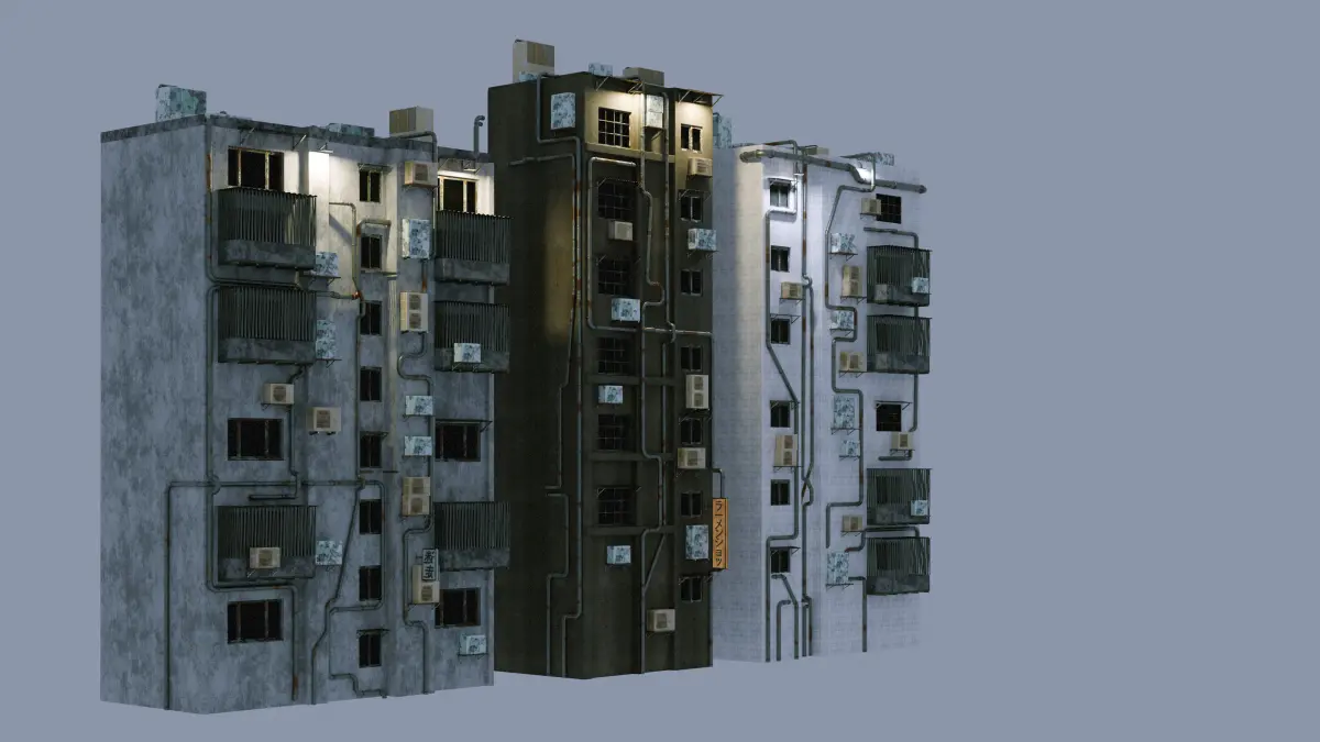 A pack of 3 Hong Kong-styled detailled buildings. All buildings are unique, and grouped to be easily moved. All assets are original assets specificaly built for this scene, made with Royalty free image and procedural textures from Blenderkit.com. Comes in .FBX, .STL and .DAE. Buildings are inspired by the game Stray, Japanese facades, and ex Kowloon Walled City.