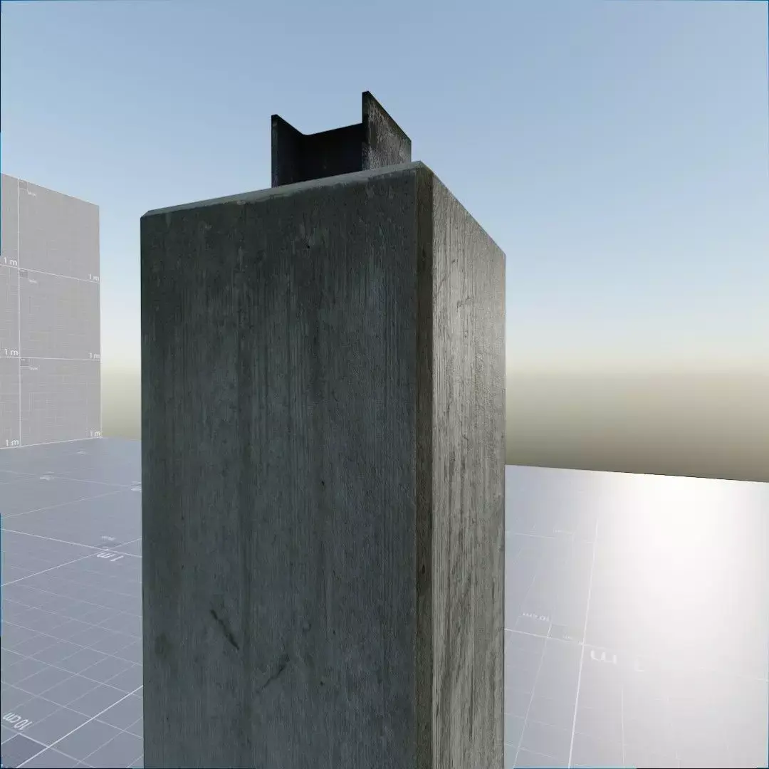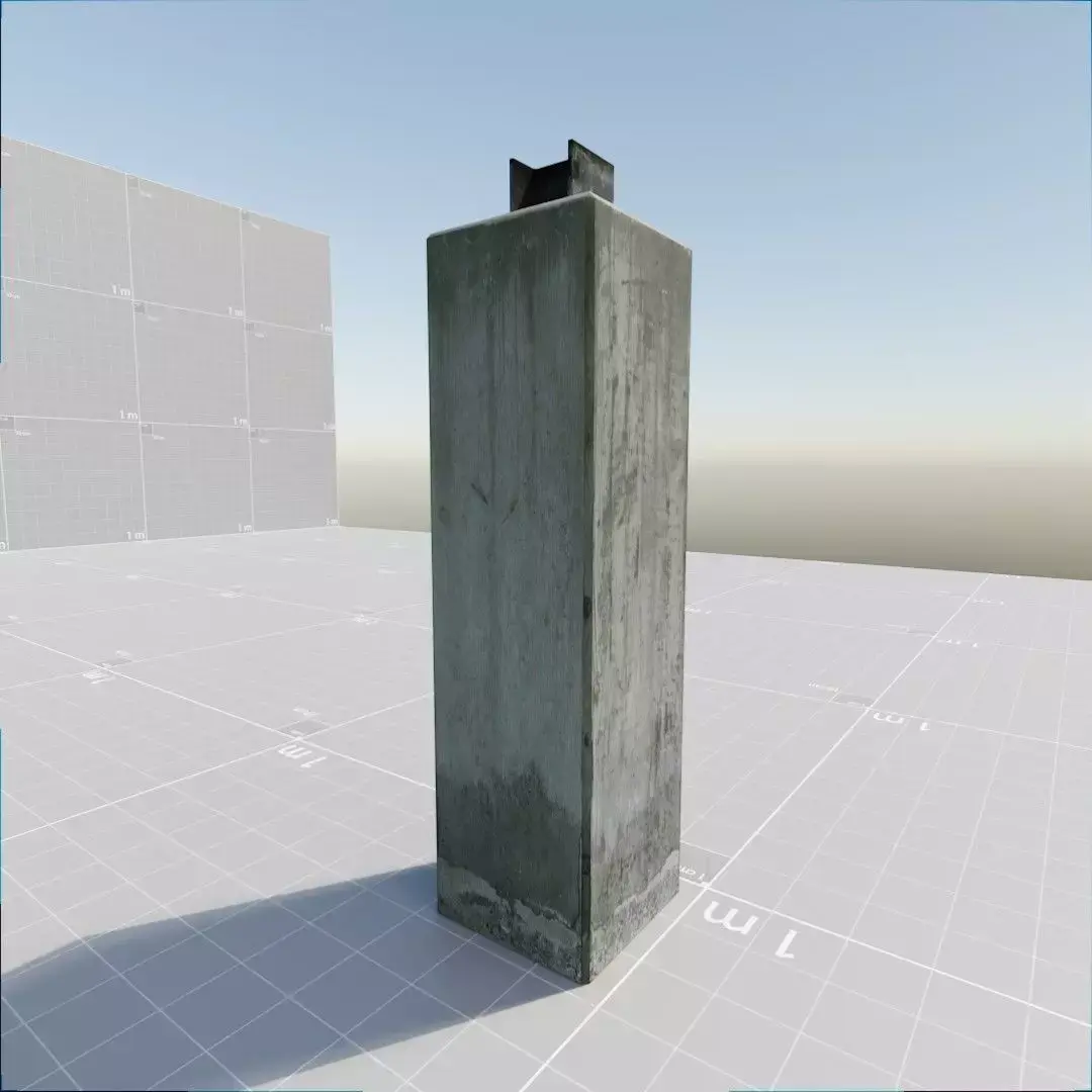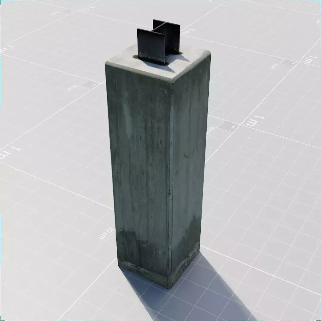 An actual simple concrete pillar, with concrete body and a steel beam on the top. Approx 1 meter high. The kind of base for vertical wood or metal pillars. Made by hand, based and photographed on a real one. Photo-real, high definition textures (around 6000 px).