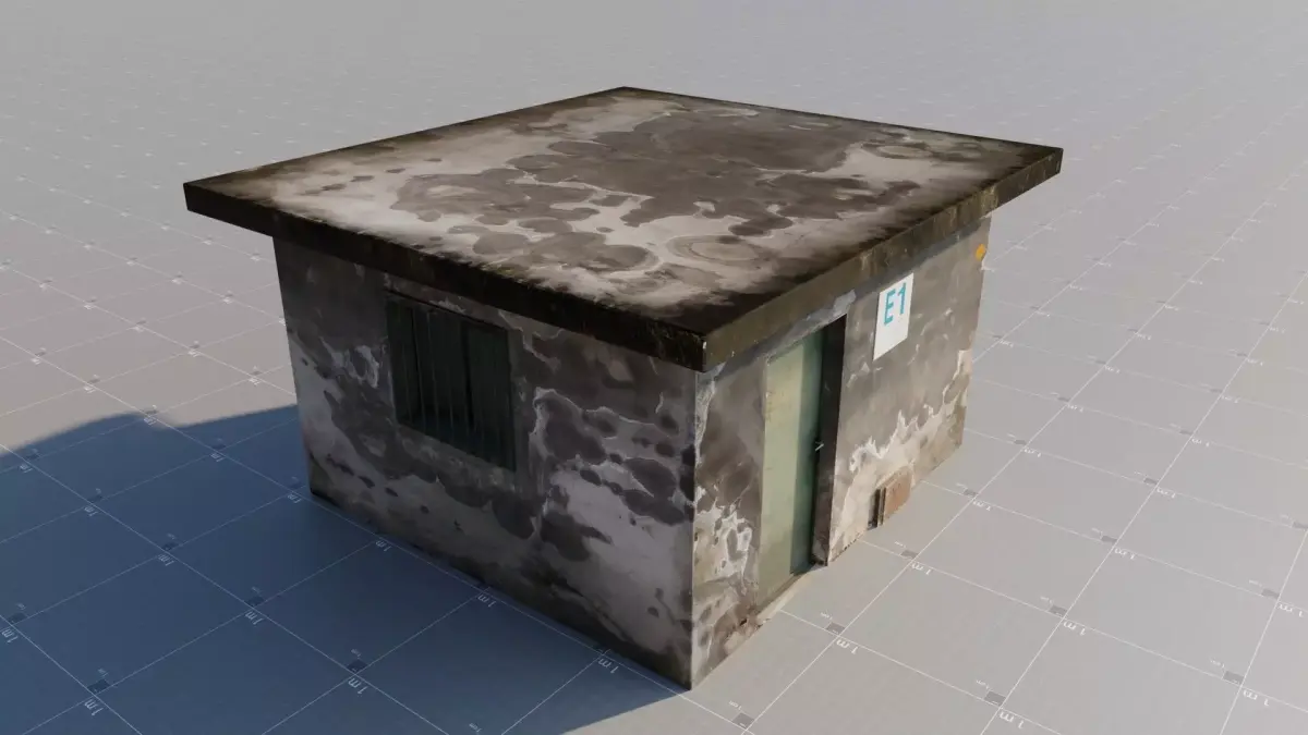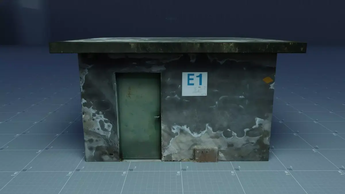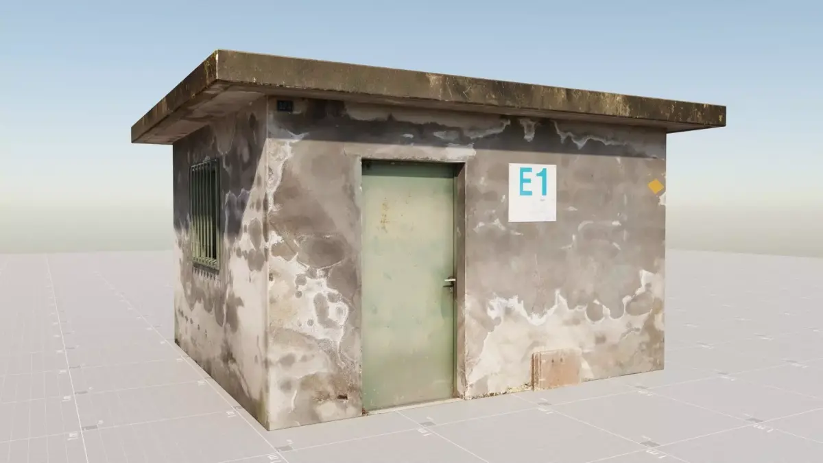 Old small industrial cabin, industrial building, concrete cabin, rusted metal door, textured, high definition, high-resolution, real-life textures