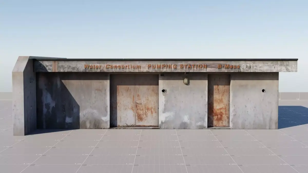 Old industrial cabin, industrial building, concrete cabin, rusted metal door, textured, high definition, high-resolution, real-life textures
