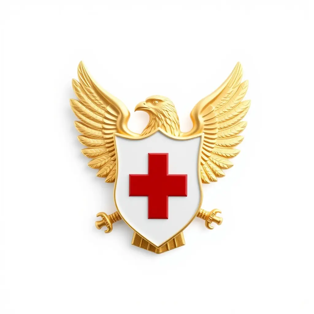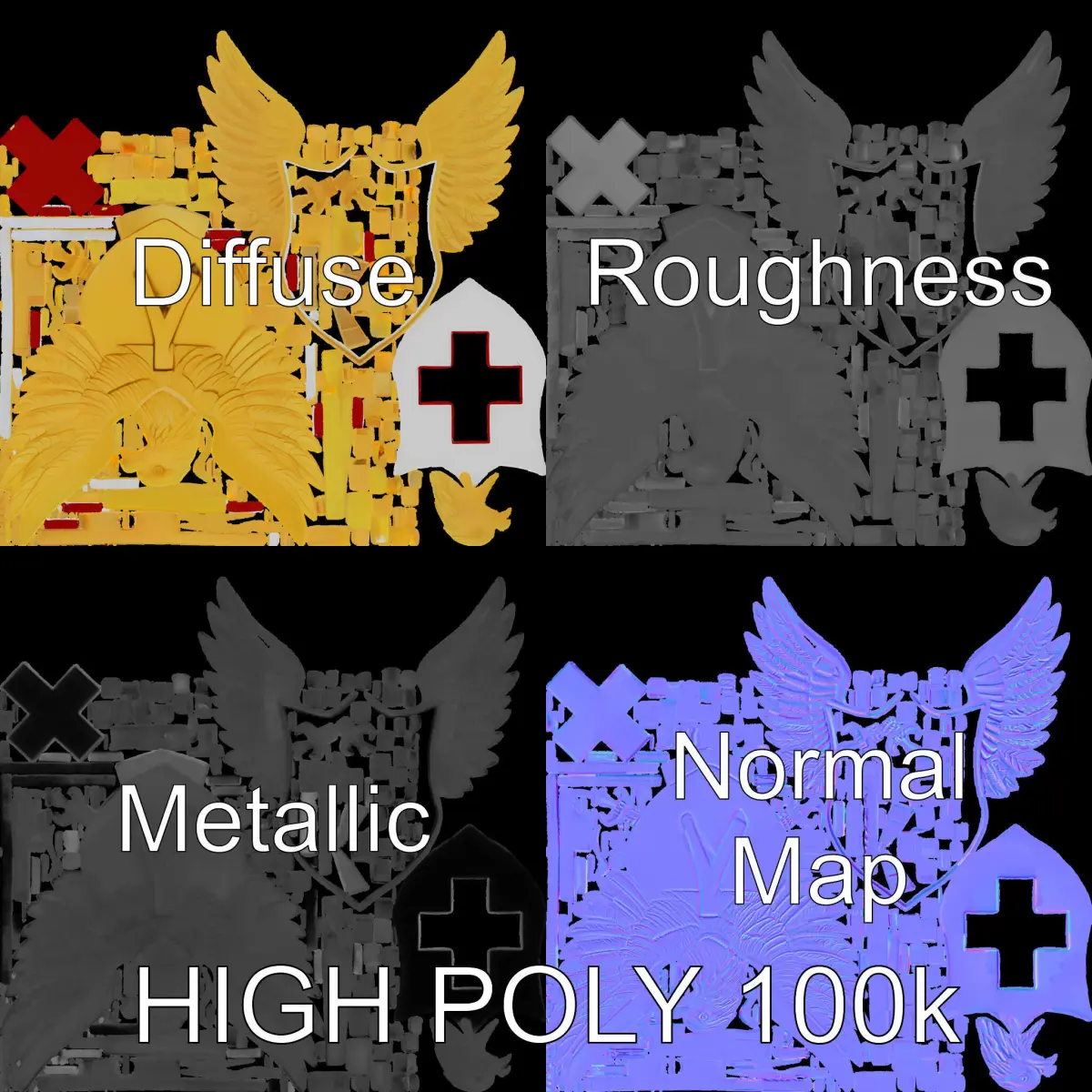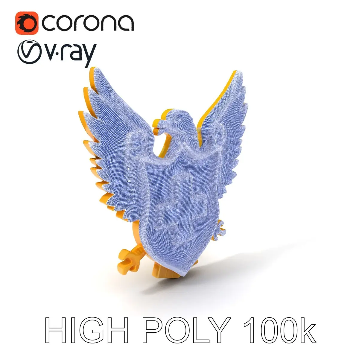 This 3D model pack features an intricately detailed eagle emblem holding a shield with a bold cross design. Each model is optimized for different uses with three levels of detail: 1000 triangles for mobile, 10,000 for environment, and 100,000 for high-resolution rendering.