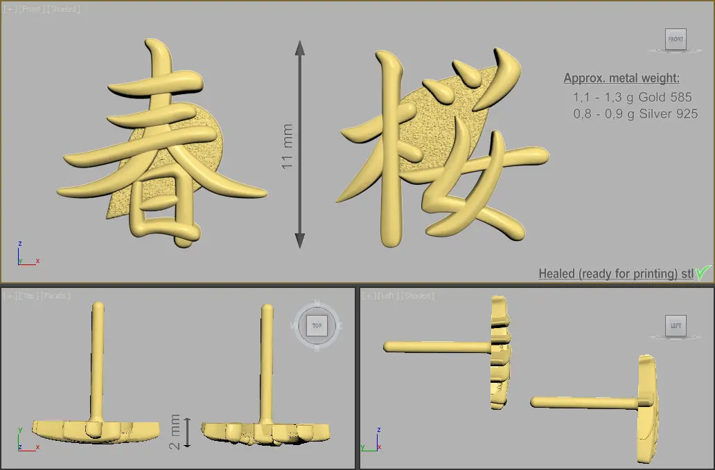 Please also note that the file does not contain any clasp. Your jeweler may provide you a pair of standard ones, there is no need to print and cast them additionally.