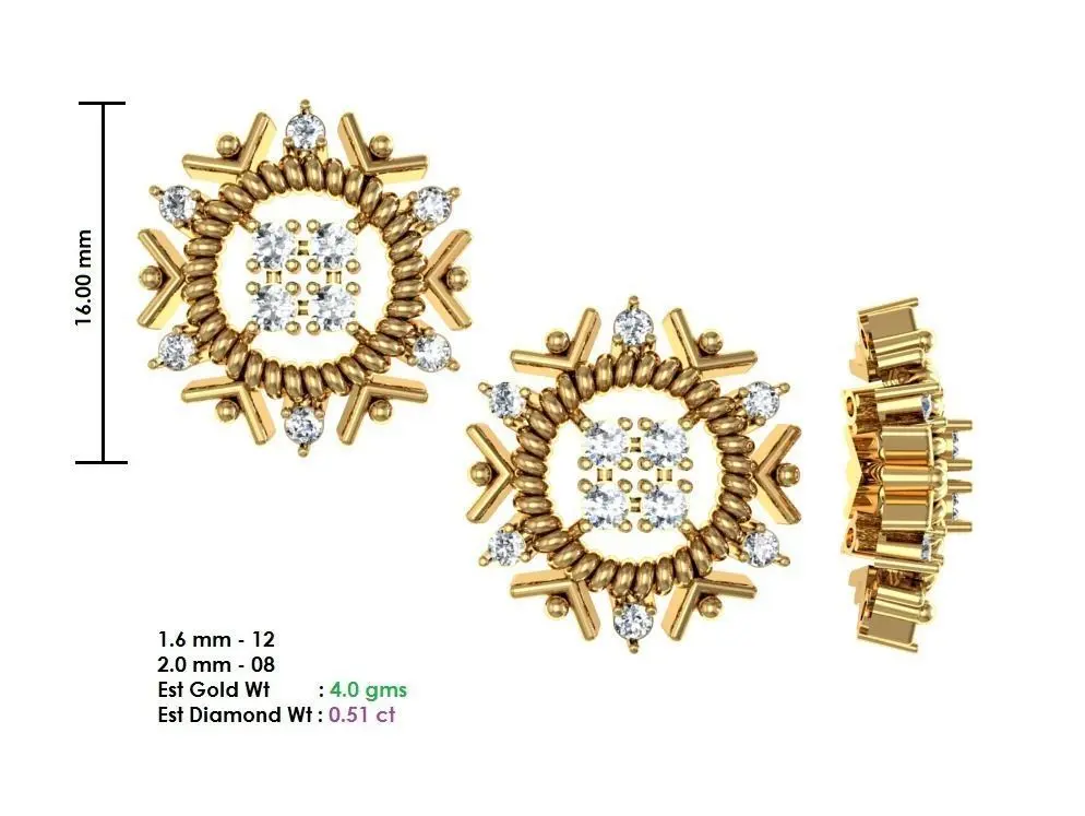 Light weighted earring with diamond size given and can be easily printed in most of the 3D printers. Dimensions and weight have been mentioned in the Picture itself