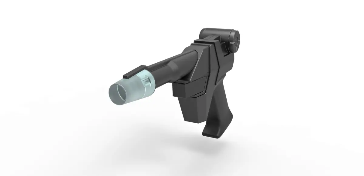 The model consists of parts: Barrel, Body part 1-3, Emitter, Handle, Side disk 1,2, Side disk insert 1-8, Side screw 1,2, Trigger.