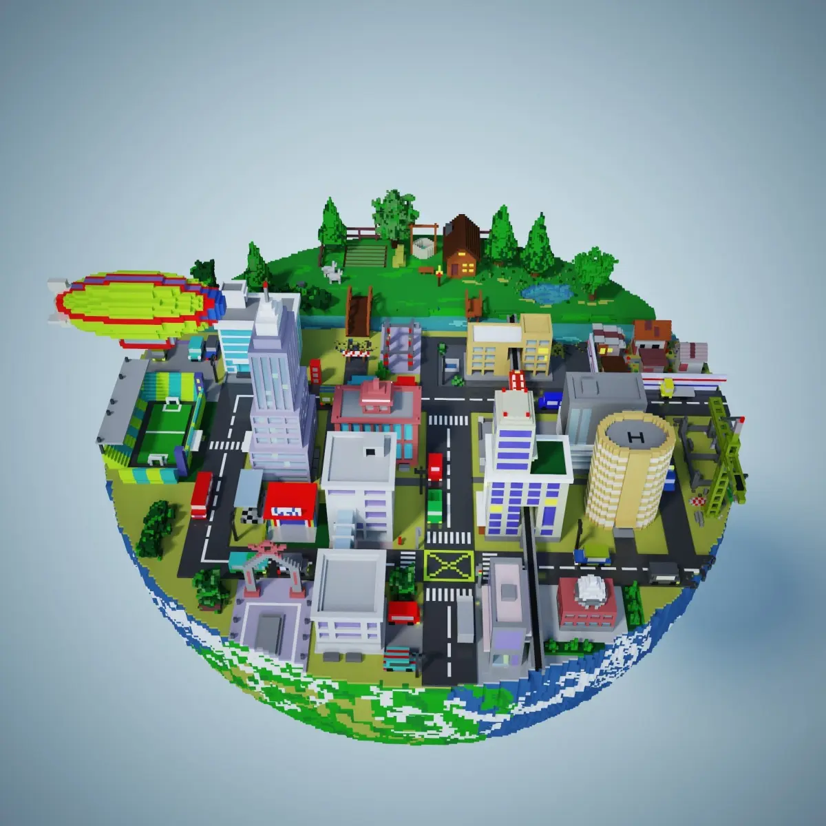 Earth with city and village landscape.Made using MagicaVoxel.Include building, stadium, street, car, crane, monorail, train, slums, river, house, tree, farm, bridge