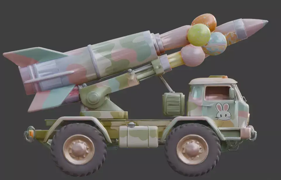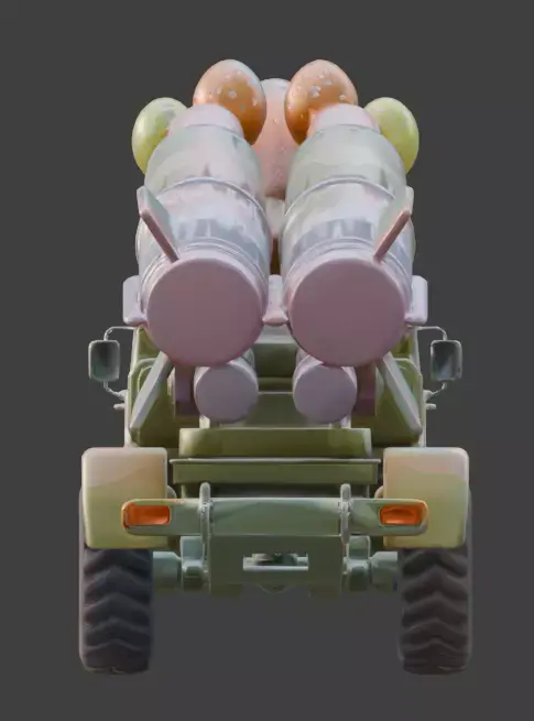 TAGSRocket Launcher, 3D Model, Easter, Military Vehicle, Pastel Camo, Festive, Holiday, Egg Missile, Missile Launcher, Truck, Stylized, Animation Asset, Rendering, Digital Art, Game Dev, Cute, Whimsical, Spring, Bunny Decal, Creative, High Detail, Industrial, Toy-like, Colorful, Multi-color, Seasonal, Fun.