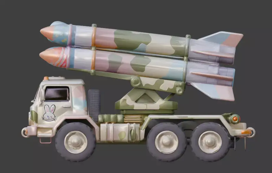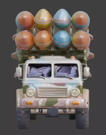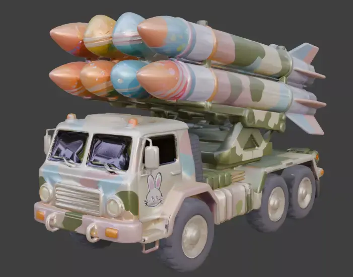 TAGSRocket Launcher, 3D Model, Easter, Military Vehicle, Pastel Camo, Festive, Holiday, Egg Missile, Missile Launcher, Truck, Stylized, Animation Asset, Rendering, Digital Art, Game Dev, Cute, Whimsical, Spring, Bunny Decal, Creative, High Detail, Industrial, Toy-like, Colorful, Multi-color, Seasonal, Fun.
