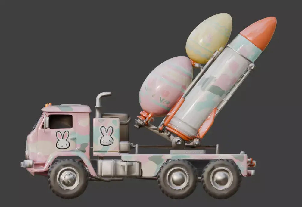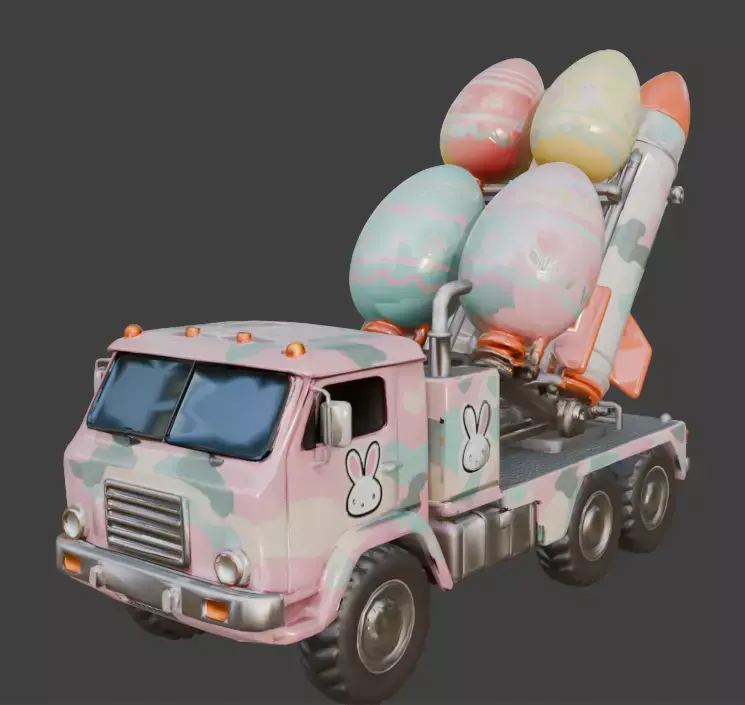 TAGSRocket Launcher, 3D Model, Easter, Military Vehicle, Pastel Camo, Festive, Holiday, Egg Missile, Missile Launcher, Truck, Stylized, Animation Asset, Rendering, Digital Art, Game Dev, Cute, Whimsical, Spring, Bunny Decal, Creative, High Detail, Industrial, Toy-like, Colorful, Multi-color, Seasonal, Fun.