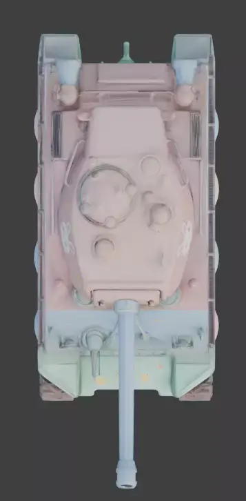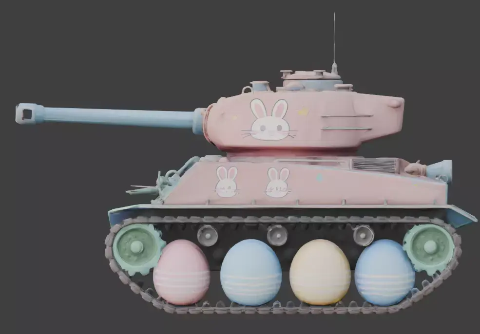 TAGSEaster Tank, 3D Model, Military Vehicle, Stylized, Pastel, Mint Green, Pink, Blue, Festive, Holiday, Bunny Decal, Floral, Egg Wheels, Armored Vehicle, Cannon, Tracks, Whimsical, Creative, High Detail, Rendering, Digital Art, Game Asset, Toy-like, Seasonal, Spring, Heavy Machinery, Character Design