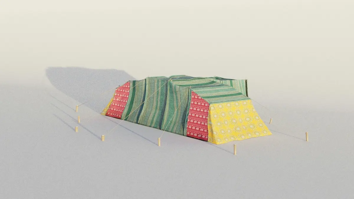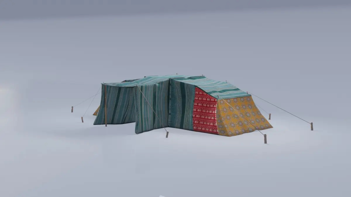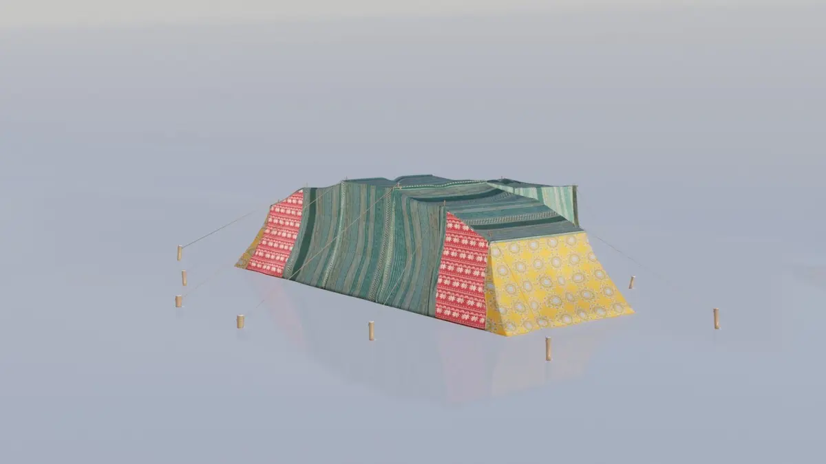 I created this 3D model in blender for the youtube clip above. The tent is relatively low poly & a cloth sim can be applied to it easily.