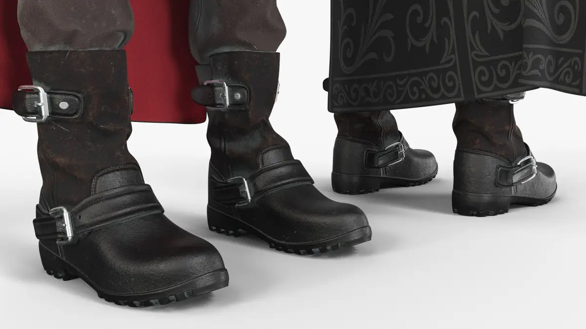 Set of evil magician or adventurer outfit item, which are fantasy style, medieval themed clothes set which depicts a battle magician-assassin outfit (fairy tale adventurer garment). This detailed model represents a complete attire combining both mystical and stealth design elements, featuring a hooded cloak, pants, shirt, shoulder armor, shoulder padboots, leather belt and bracers.
