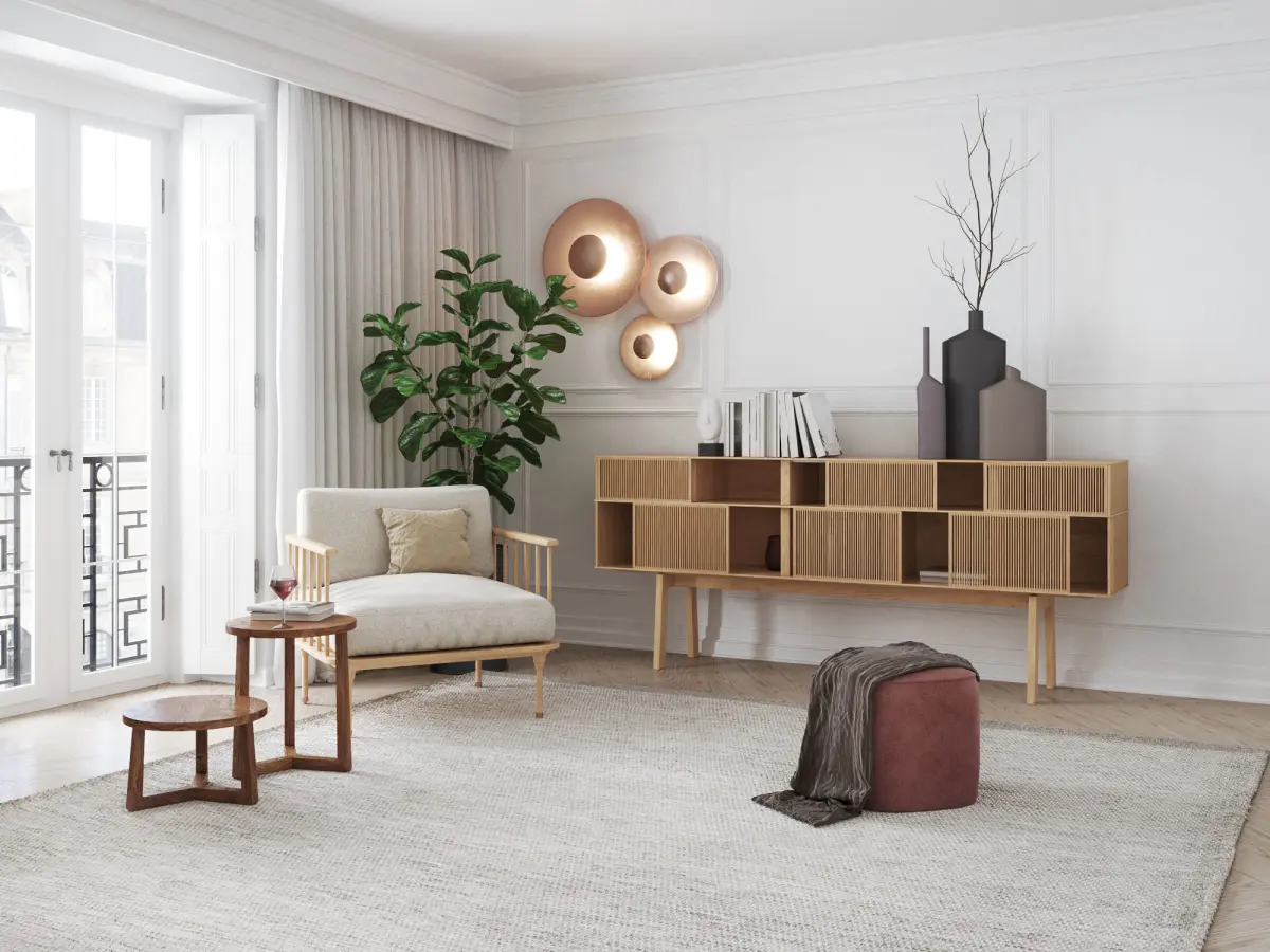 This atmospheric interior is kept in warm shades of white and beige, which is why we perceive it as light and bright.An important element of this arrangement are natural materials such as wood, but also structural fabrics and carpets.This is a very sensual aspect of this space.Walls with stucco and window joinery are a kind of frame for the whole arrangement and give it elegance.Furniture and accessories in this space give it an artistic and eclectic character, which always makes the interior interesting.