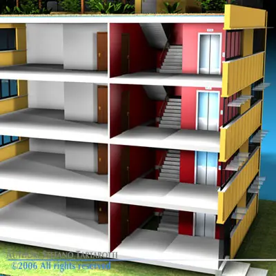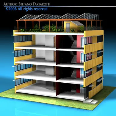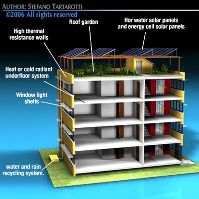Building optimized for low emission. With heat or cold radiant underfloor system, window light shelfs to control rooms sun lighting , high thermal resistance walls, hor water solar panels and energy cell solar panels, roof garden, water and rain recycling system.