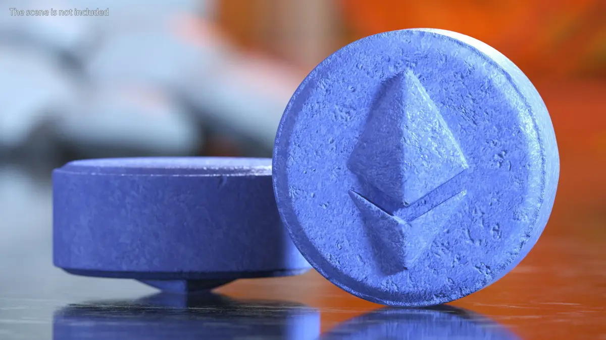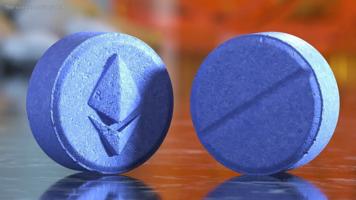 Ecstasy Pill with Ethereum Symbol is a three-dimensional model of a recreational drug in tablet form which is unhealthy illegal medicine.