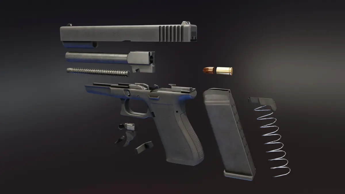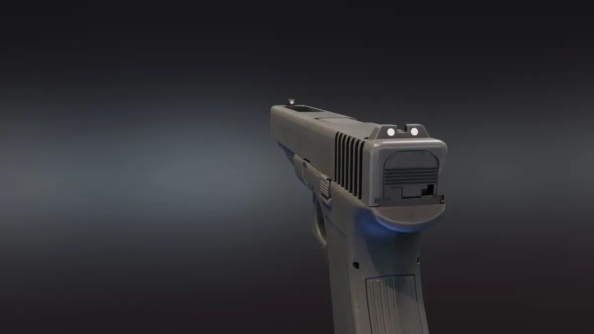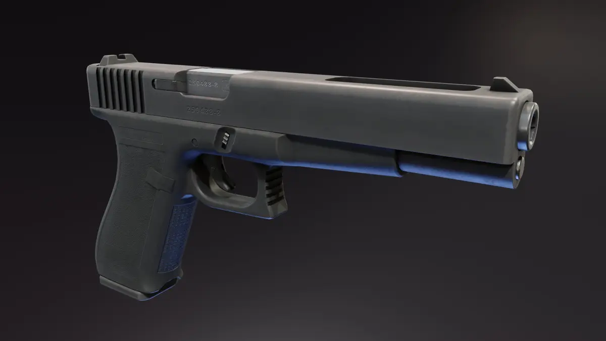 Its based on (redacted) 17L model chambered in 9x19mm but have few changes on it, it have enlarged slider and longer recoli spring guide rod, tad different paterns on grip and its all dark grey(not that visible separation of metal slider and polimer frame). In some promotional graphics/posters/fanart gun there are few differences(checkering or line on front frame) but I used reference images from anime screens.